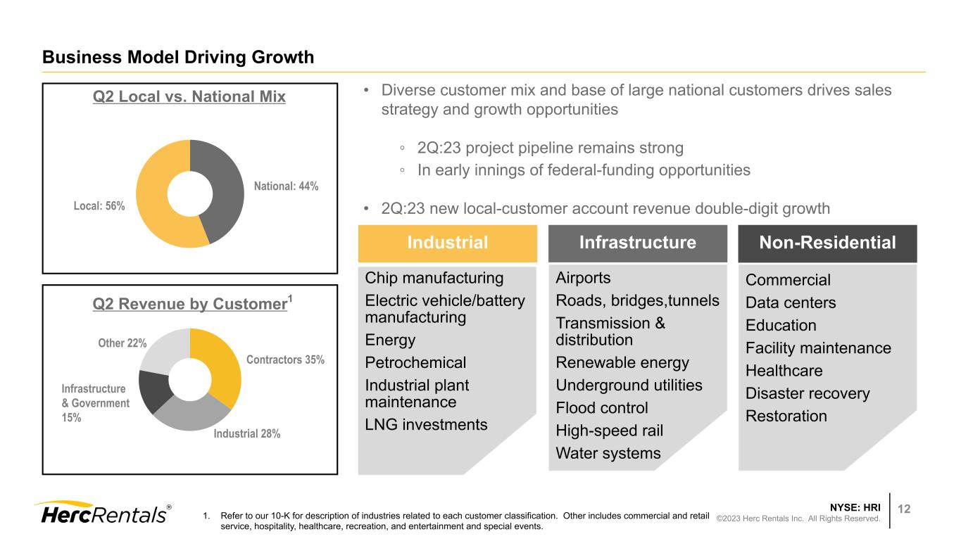 NYSE: HRI ©2023 Herc Rentals Inc. All Rights Reserved. 11 Managing Fleet for Enhanced Utilization 1. Original equipment cost based on ARA guidelines. Fleet Expenditures at OEC1 $253 $327 $311 $327$348 $400 2022 2023 Q1 Q2 Q3 Q4 $64 $64 $54 $140$144 $186 2022 2023 Q1 Q2 Q3 Q4 Fleet Disposals at OEC1 $ in millions$ in millions • Fleet disposals generated ~47% proceeds as a percent of OEC • Margin on disposals was 33% in Q2 2023, a 620 bp improvement over prior year • Average age of disposals was 90 months in Q2 2023 • Average fleet age of 46 months at June 30, 2023 • Refreshing fleet faster to adjust to higher OEM shipments and to take advantage of still-strong used equipment market • Q2 2023 fleet expenditures reflect 2021/2022 OEM catch-up orders and 2023 fleet build into the strength of the construction season • Capital allocated for category classes that are still constrained will be re-allocated to 2024