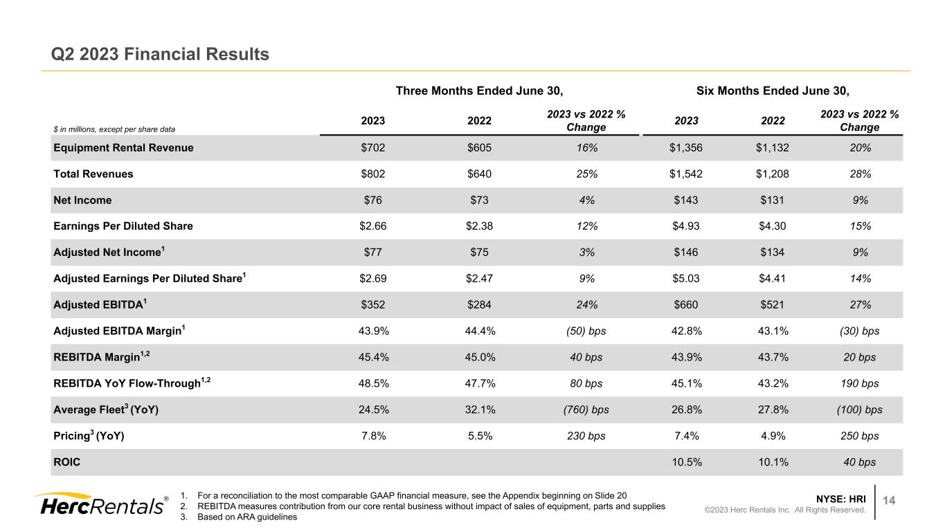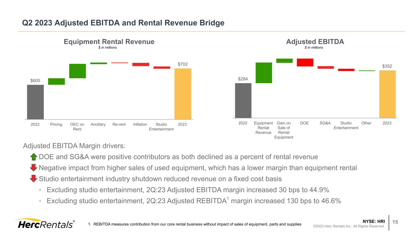NYSE: HRI ©2023 Herc Rentals Inc. All Rights Reserved. 14 Q2 2023 Financial Results Three Months Ended June 30, Six Months Ended June 30, $ in millions, except per share data 2023 2022 2023 vs 2022 % Change 2023 2022 2023 vs 2022 % Change Equipment Rental Revenue $702 $605 16% $1,356 $1,132 20% Total Revenues $802 $640 25% $1,542 $1,208 28% Net Income $76 $73 4% $143 $131 9% Earnings Per Diluted Share $2.66 $2.38 12% $4.93 $4.30 15% Adjusted Net Income1 $77 $75 3% $146 $134 9% Adjusted Earnings Per Diluted Share1 $2.69 $2.47 9% $5.03 $4.41 14% Adjusted EBITDA1 $352 $284 24% $660 $521 27% Adjusted EBITDA Margin1 43.9% 44.4% (50) bps 42.8% 43.1% (30) bps REBITDA Margin1,2 45.4% 45.0% 40 bps 43.9% 43.7% 20 bps REBITDA YoY Flow-Through1,2 48.5% 47.7% 80 bps 45.1% 43.2% 190 bps Average Fleet3 (YoY) 24.5% 32.1% (760) bps 26.8% 27.8% (100) bps Pricing3 (YoY) 7.8% 5.5% 230 bps 7.4% 4.9% 250 bps ROIC 10.5% 10.1% 40 bps 1. For a reconciliation to the most comparable GAAP financial measure, see the Appendix beginning on Slide 20 2. REBITDA measures contribution from our core rental business without impact of sales of equipment, parts and supplies 3. Based on ARA guidelines