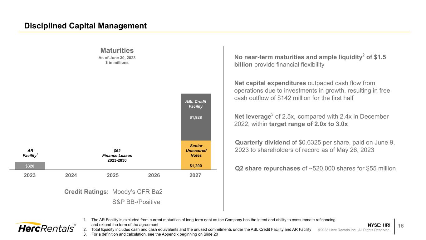 NYSE: HRI ©2023 Herc Rentals Inc. All Rights Reserved. 15 Q2 2023 Adjusted EBITDA and Rental Revenue Bridge Adjusted EBITDA $284 $352 2022 Equipment Rental Revenue Gain on Sale of Rental Equipment DOE SG&A Studio Entertainment Other 2023 Equipment Rental Revenue $605 $702 2022 Pricing OEC on Rent Ancillary Re-rent Inflation Studio Entertainment 2023 Adjusted EBITDA Margin drivers: DOE and SG&A were positive contributors as both declined as a percent of rental revenue Negative impact from higher sales of used equipment, which has a lower margin than equipment rental Studio entertainment industry shutdown reduced revenue on a fixed cost basis ◦ Excluding studio entertainment, 2Q:23 Adjusted EBITDA margin increased 30 bps to 44.9% ◦ Excluding studio entertainment, 2Q:23 Adjusted REBITDA1 margin increased 130 bps to 46.6% $ in millions $ in millions 1. REBITDA measures contribution from our core rental business without impact of sales of equipment, parts and supplies