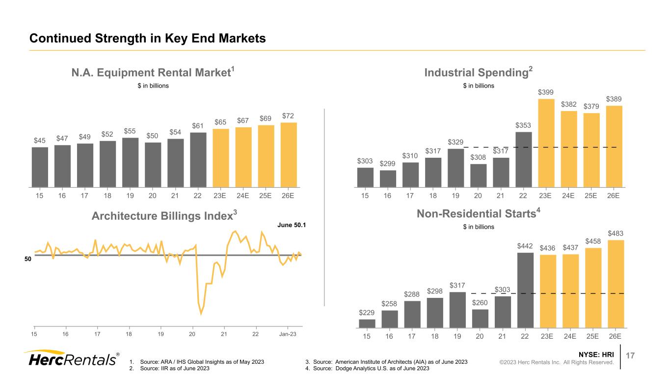 NYSE: HRI ©2023 Herc Rentals Inc. All Rights Reserved. 16 Disciplined Capital Management Maturities As of June 30, 2023 $ in millions $1,200 $1,928 $320 2023 2024 2025 2026 2027 No near-term maturities and ample liquidity2 of $1.5 billion provide financial flexibility Net capital expenditures outpaced cash flow from operations due to investments in growth, resulting in free cash outflow of $142 million for the first half Net leverage3 of 2.5x, compared with 2.4x in December 2022, within target range of 2.0x to 3.0x Quarterly dividend of $0.6325 per share, paid on June 9, 2023 to shareholders of record as of May 26, 2023 Q2 share repurchases of ~520,000 shares for $55 million 1. The AR Facility is excluded from current maturities of long-term debt as the Company has the intent and ability to consummate refinancing and extend the term of the agreement 2. Total liquidity includes cash and cash equivalents and the unused commitments under the ABL Credit Facility and AR Facility 3. For a definition and calculation, see the Appendix beginning on Slide 20 $62 Finance Leases 2023-2030 AR Facility1 ABL Credit Facility Senior Unsecured Notes Credit Ratings: Moody’s CFR Ba2 S&P BB-/Positive