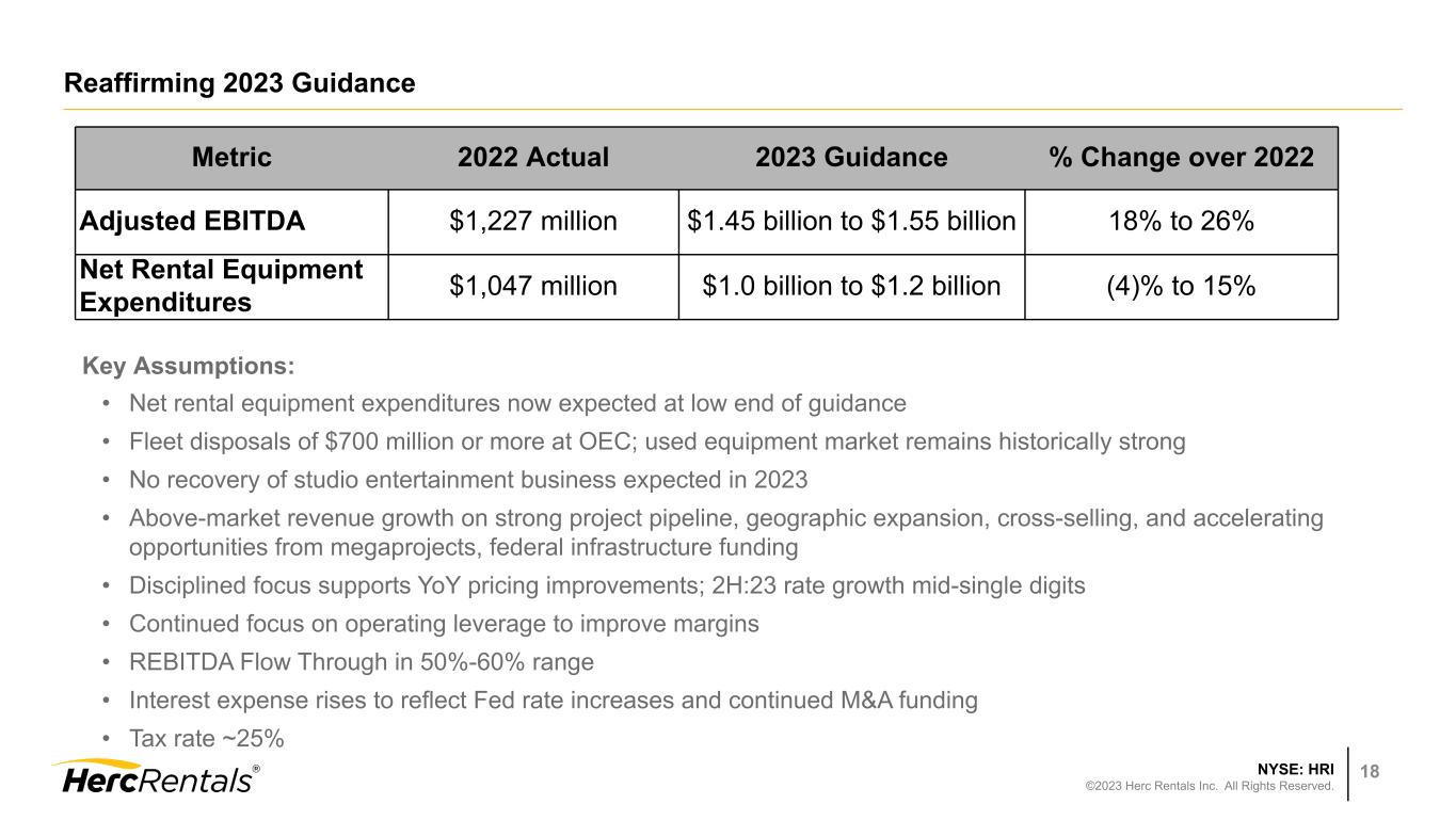 NYSE: HRI ©2023 Herc Rentals Inc. All Rights Reserved. 17 Continued Strength in Key End Markets N.A. Equipment Rental Market1 $45 $47 $49 $52 $55 $50 $54 $61 $65 $67 $69 $72 15 16 17 18 19 20 21 22 23E 24E 25E 26E 1. Source: ARA / IHS Global Insights as of May 2023 3. Source: American Institute of Architects (AIA) as of June 2023 2. Source: IIR as of June 2023 4. Source: Dodge Analytics U.S. as of June 2023 $ in billions Industrial Spending2 $303 $299 $310 $317 $329 $308 $317 $353 $399 $382 $379 $389 15 16 17 18 19 20 21 22 23E 24E 25E 26E $ in billions Non-Residential Starts4 $229 $258 $288 $298 $317 $260 $303 $442 $436 $437 $458 $483 15 16 17 18 19 20 21 22 23E 24E 25E 26E $ in billions — — — — — — — — — — — — — — — — — — — — — — — — — — — — — — — — Architecture Billings Index3 15 16 17 18 19 20 21 22 Jan-23 June 50.1 50