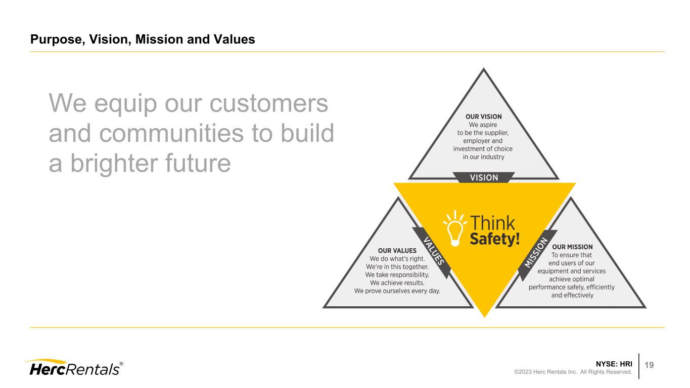 NYSE: HRI ©2023 Herc Rentals Inc. All Rights Reserved. 18 Reaffirming 2023 Guidance Key Assumptions: • Net rental equipment expenditures now expected at low end of guidance • Fleet disposals of $700 million or more at OEC; used equipment market remains historically strong • No recovery of studio entertainment business expected in 2023 • Above-market revenue growth on strong project pipeline, geographic expansion, cross-selling, and accelerating opportunities from megaprojects, federal infrastructure funding • Disciplined focus supports YoY pricing improvements; 2H:23 rate growth mid-single digits • Continued focus on operating leverage to improve margins • REBITDA Flow Through in 50%-60% range • Interest expense rises to reflect Fed rate increases and continued M&A funding • Tax rate ~25% Metric 2022 Actual 2023 Guidance % Change over 2022 Adjusted EBITDA $1,227 million $1.45 billion to $1.55 billion 18% to 26% Net Rental Equipment Expenditures $1,047 million $1.0 billion to $1.2 billion (4)% to 15%