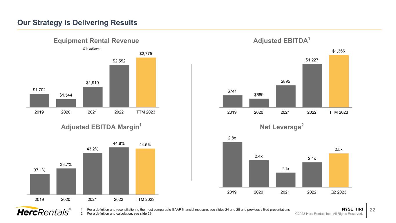 NYSE: HRI ©2023 Herc Rentals Inc. All Rights Reserved. 21 Glossary of Terms Commonly Used in the Industry OEC: Original Equipment Cost which is an operating measure based on the guidelines of the American Rental Association (ARA), which is calculated as the cost of the asset at the time it was first purchased plus additional capitalized refurbishment costs (with the basis of refurbished assets reset at the refurbishment date). Fleet Age: The OEC weighted age of the entire fleet, based on ARA guidelines. Net Fleet Capital Expenditures: Capital expenditures of rental equipment minus the proceeds from disposal of rental equipment. Dollar Utilization ($ UT): Dollar utilization is an operating measure calculated by dividing equipment rental revenue (excluding re-rent, delivery, pick-up and other ancillary revenue) by the average OEC of the equipment fleet for the relevant time period, based on ARA guidelines. Pricing: Change in pure pricing achieved in one period versus another period. This is applied both to year-over-year and sequential comparisons. Rental rates are based on ARA guidelines and are calculated based on the category class rate variance achieved either year-over-year or sequentially for any fleet that qualifies for the fleet base and weighted by the prior year revenue mix.