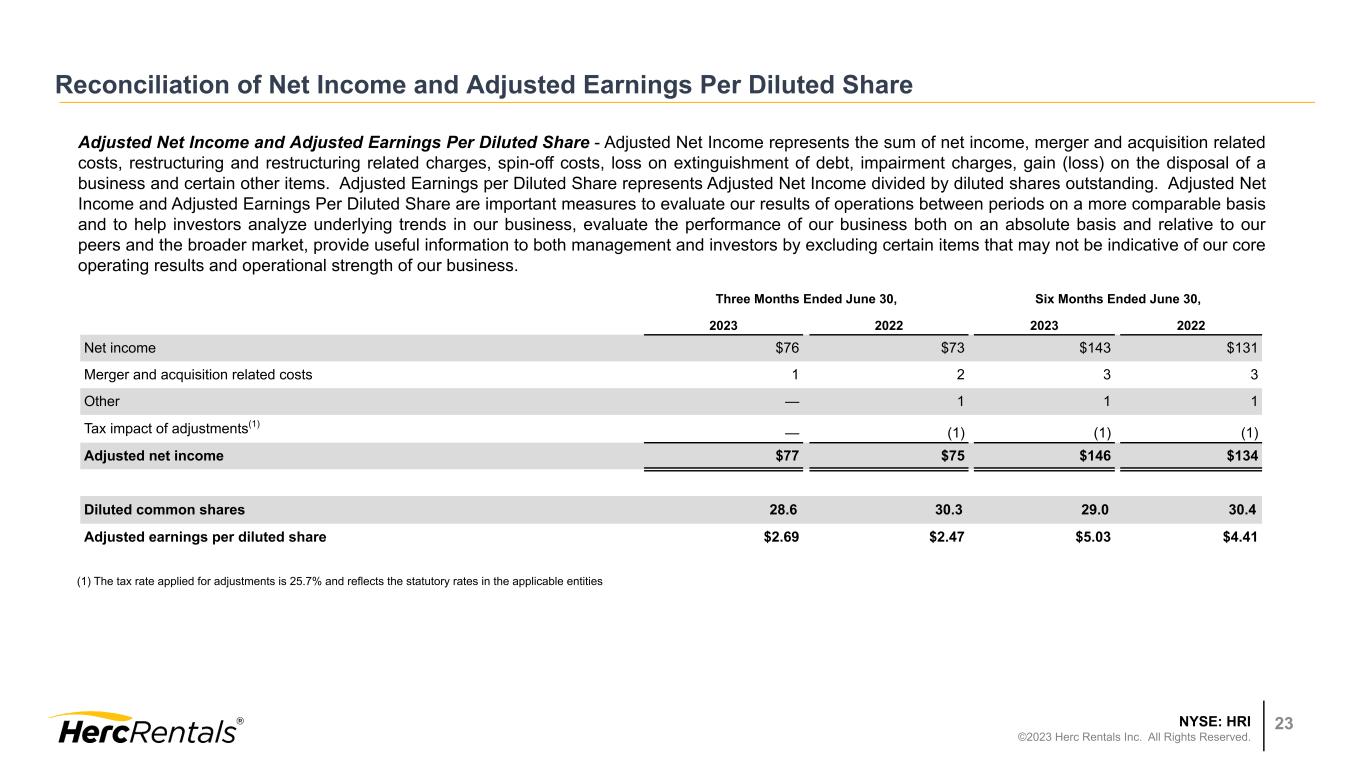 NYSE: HRI ©2023 Herc Rentals Inc. All Rights Reserved. 23 Reconciliation of Net Income and Adjusted Earnings Per Diluted Share Adjusted Net Income and Adjusted Earnings Per Diluted Share - Adjusted Net Income represents the sum of net income, merger and acquisition related costs, restructuring and restructuring related charges, spin-off costs, loss on extinguishment of debt, impairment charges, gain (loss) on the disposal of a business and certain other items. Adjusted Earnings per Diluted Share represents Adjusted Net Income divided by diluted shares outstanding. Adjusted Net Income and Adjusted Earnings Per Diluted Share are important measures to evaluate our results of operations between periods on a more comparable basis and to help investors analyze underlying trends in our business, evaluate the performance of our business both on an absolute basis and relative to our peers and the broader market, provide useful information to both management and investors by excluding certain items that may not be indicative of our core operating results and operational strength of our business. (1) The tax rate applied for adjustments is 25.7% and reflects the statutory rates in the applicable entities Three Months Ended June 30, Six Months Ended June 30, 2023 2022 2023 2022 Net income $76 $73 $143 $131 Merger and acquisition related costs 1 2 3 3 Other — 1 1 1 Tax impact of adjustments(1) — (1) (1) (1) Adjusted net income $77 $75 $146 $134 Diluted common shares 28.6 30.3 29.0 30.4 Adjusted earnings per diluted share $2.69 $2.47 $5.03 $4.41