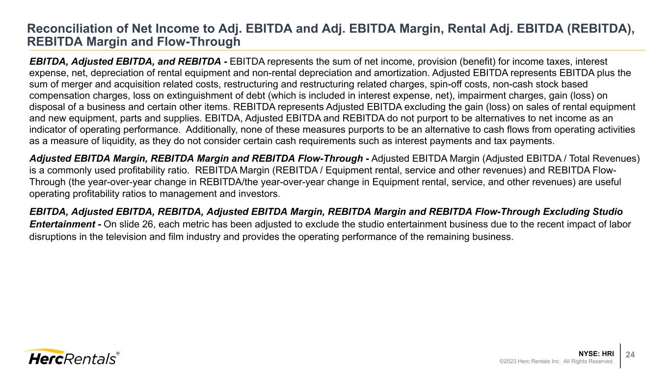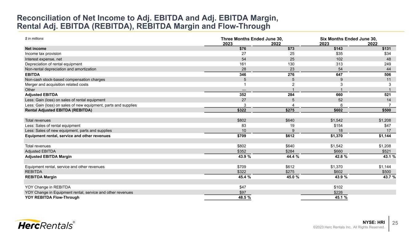 NYSE: HRI ©2023 Herc Rentals Inc. All Rights Reserved. 24 Reconciliation of Net Income to Adj. EBITDA and Adj. EBITDA Margin, Rental Adj. EBITDA (REBITDA), REBITDA Margin and Flow-Through EBITDA, Adjusted EBITDA, and REBITDA - EBITDA represents the sum of net income, provision (benefit) for income taxes, interest expense, net, depreciation of rental equipment and non-rental depreciation and amortization. Adjusted EBITDA represents EBITDA plus the sum of merger and acquisition related costs, restructuring and restructuring related charges, spin-off costs, non-cash stock based compensation charges, loss on extinguishment of debt (which is included in interest expense, net), impairment charges, gain (loss) on disposal of a business and certain other items. REBITDA represents Adjusted EBITDA excluding the gain (loss) on sales of rental equipment and new equipment, parts and supplies. EBITDA, Adjusted EBITDA and REBITDA do not purport to be alternatives to net income as an indicator of operating performance. Additionally, none of these measures purports to be an alternative to cash flows from operating activities as a measure of liquidity, as they do not consider certain cash requirements such as interest payments and tax payments. Adjusted EBITDA Margin, REBITDA Margin and REBITDA Flow-Through - Adjusted EBITDA Margin (Adjusted EBITDA / Total Revenues) is a commonly used profitability ratio. REBITDA Margin (REBITDA / Equipment rental, service and other revenues) and REBITDA Flow- Through (the year-over-year change in REBITDA/the year-over-year change in Equipment rental, service, and other revenues) are useful operating profitability ratios to management and investors. EBITDA, Adjusted EBITDA, REBITDA, Adjusted EBITDA Margin, REBITDA Margin and REBITDA Flow-Through Excluding Studio Entertainment - On slide 26, each metric has been adjusted to exclude the studio entertainment business due to the recent impact of labor disruptions in the television and film industry and provides the operating performance of the remaining business.