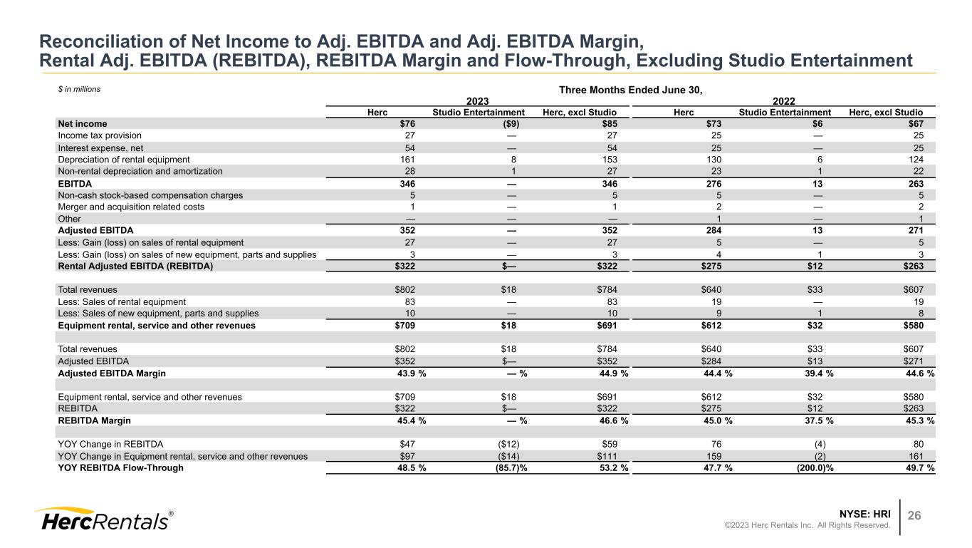 NYSE: HRI ©2023 Herc Rentals Inc. All Rights Reserved. 25 Reconciliation of Net Income to Adj. EBITDA and Adj. EBITDA Margin, Rental Adj. EBITDA (REBITDA), REBITDA Margin and Flow-Through $ in millions Three Months Ended June 30, Six Months Ended June 30, 2023 2022 2023 2022 Net income $76 $73 $143 $131 Income tax provision 27 25 $35 $34 Interest expense, net 54 25 102 48 Depreciation of rental equipment 161 130 313 249 Non-rental depreciation and amortization 28 23 54 44 EBITDA 346 276 647 506 Non-cash stock-based compensation charges 5 5 9 11 Merger and acquisition related costs 1 2 3 3 Other — 1 1 1 Adjusted EBITDA 352 284 660 521 Less: Gain (loss) on sales of rental equipment 27 5 52 14 Less: Gain (loss) on sales of new equipment, parts and supplies 3 4 6 7 Rental Adjusted EBITDA (REBITDA) $322 $275 $602 $500 Total revenues $802 $640 $1,542 $1,208 Less: Sales of rental equipment 83 19 $154 $47 Less: Sales of new equipment, parts and supplies 10 9 18 17 Equipment rental, service and other revenues $709 $612 $1,370 $1,144 Total revenues $802 $640 $1,542 $1,208 Adjusted EBITDA $352 $284 $660 $521 Adjusted EBITDA Margin 43.9 % 44.4 % 42.8 % 43.1 % Equipment rental, service and other revenues $709 $612 $1,370 $1,144 REBITDA $322 $275 $602 $500 REBITDA Margin 45.4 % 45.0 % 43.9 % 43.7 % YOY Change in REBITDA $47 $102 YOY Change in Equipment rental, service and other revenues $97 $226 YOY REBITDA Flow-Through 48.5 % 45.1 %