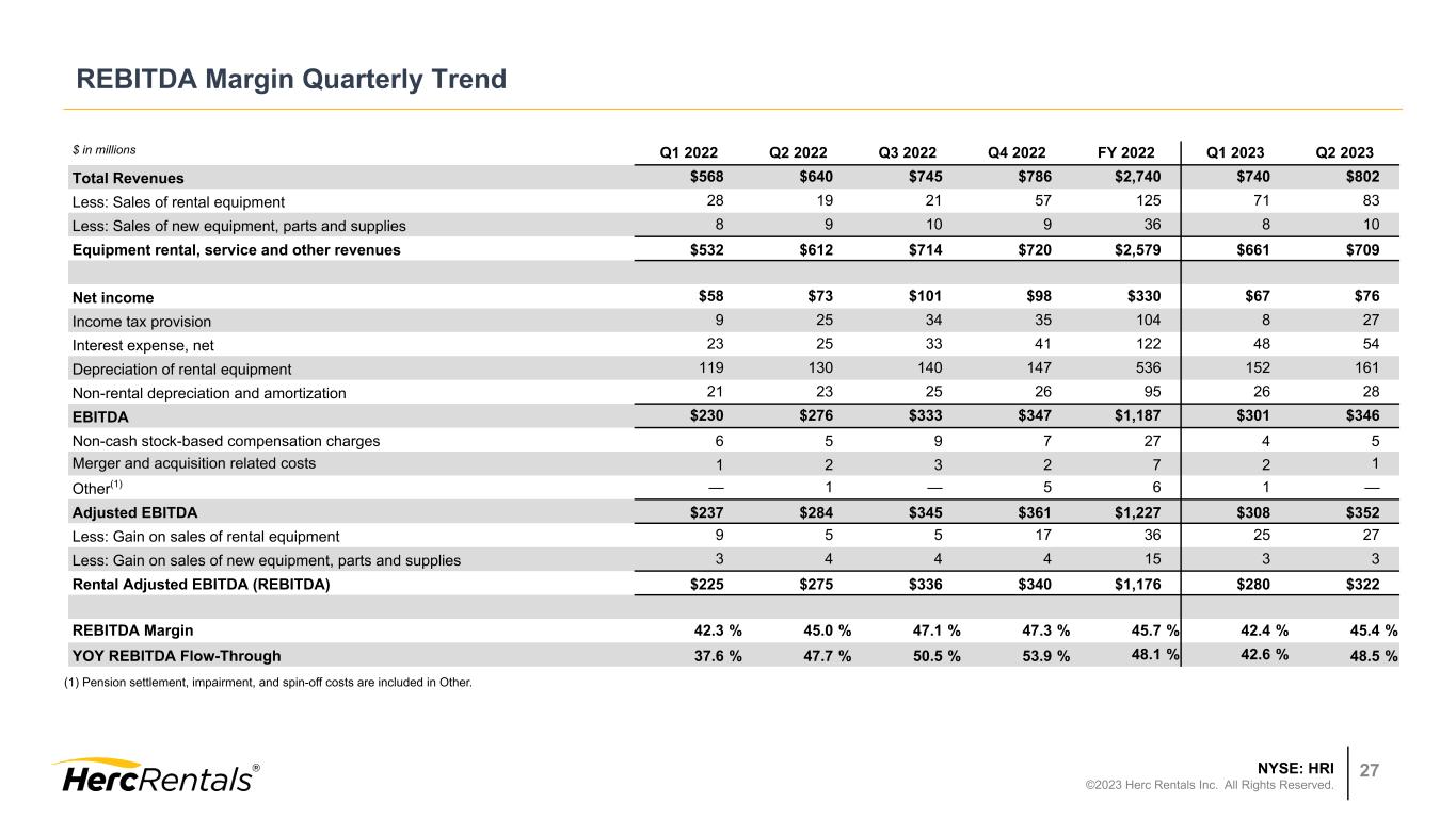 NYSE: HRI ©2023 Herc Rentals Inc. All Rights Reserved. 26 Reconciliation of Net Income to Adj. EBITDA and Adj. EBITDA Margin, Rental Adj. EBITDA (REBITDA), REBITDA Margin and Flow-Through, Excluding Studio Entertainment $ in millions Three Months Ended June 30, 2023 2022 Herc Studio Entertainment Herc, excl Studio Herc Studio Entertainment Herc, excl Studio Net income $76 ($9) $85 $73 $6 $67 Income tax provision 27 — 27 25 — 25 Interest expense, net 54 — 54 25 — 25 Depreciation of rental equipment 161 8 153 130 6 124 Non-rental depreciation and amortization 28 1 27 23 1 22 EBITDA 346 — 346 276 13 263 Non-cash stock-based compensation charges 5 — 5 5 — 5 Merger and acquisition related costs 1 — 1 2 — 2 Other — — — 1 — 1 Adjusted EBITDA 352 — 352 284 13 271 Less: Gain (loss) on sales of rental equipment 27 — 27 5 — 5 Less: Gain (loss) on sales of new equipment, parts and supplies 3 — 3 4 1 3 Rental Adjusted EBITDA (REBITDA) $322 $— $322 $275 $12 $263 Total revenues $802 $18 $784 $640 $33 $607 Less: Sales of rental equipment 83 — 83 19 — 19 Less: Sales of new equipment, parts and supplies 10 — 10 9 1 8 Equipment rental, service and other revenues $709 $18 $691 $612 $32 $580 Total revenues $802 $18 $784 $640 $33 $607 Adjusted EBITDA $352 $— $352 $284 $13 $271 Adjusted EBITDA Margin 43.9 % — % 44.9 % 44.4 % 39.4 % 44.6 % Equipment rental, service and other revenues $709 $18 $691 $612 $32 $580 REBITDA $322 $— $322 $275 $12 $263 REBITDA Margin 45.4 % — % 46.6 % 45.0 % 37.5 % 45.3 % YOY Change in REBITDA $47 ($12) $59 76 (4) 80 YOY Change in Equipment rental, service and other revenues $97 ($14) $111 159 (2) 161 YOY REBITDA Flow-Through 48.5 % (85.7) % 53.2 % 47.7 % (200.0) % 49.7 %