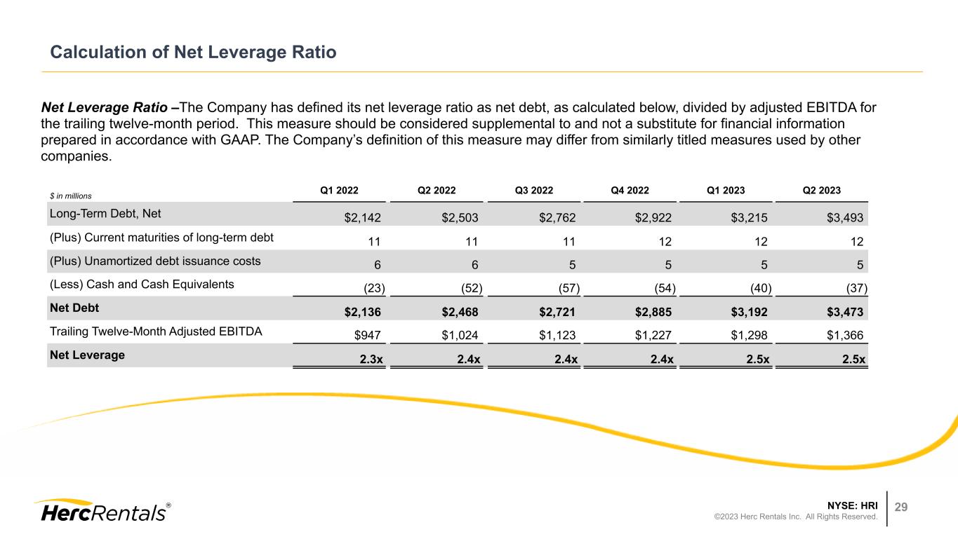 NYSE: HRI ©2023 Herc Rentals Inc. All Rights Reserved. 28 REBITDA Margin Annual Trend $ in millions 2018 2019 2020 2021 2022 Total Revenues $1,978 $1,999 $1,780 $2,073 $2,740 Less: Sales of rental equipment 256 243 198 113 125 Less: Sales of new equipment, parts and supplies 49 44 28 31 36 Equipment rental, service and other revenues $1,673 $1,712 $1,554 $1,929 $2,579 Net income $69 $47 $74 $224 $330 Income tax provision (benefit) — 16 20 67 104 Interest expense, net 137 174 93 86 122 Depreciation of rental equipment 387 410 403 420 536 Non-rental depreciation and amortization 58 62 63 68 95 EBITDA $651 $709 $653 $865 $1,187 Restructuring 5 8 1 — — Spin-off costs 15 — — — — Non-cash stock-based compensation charges 14 19 16 23 27 Impairment — 4 15 3 3 Merger and acquisition related costs — — — 4 7 Loss on disposal of business — — 3 — — Other 1 1 1 — 3 Adjusted EBITDA $686 $741 $689 $895 $1,227 Less: Gain (loss) on sales of rental equipment 12 (1) (5) 19 36 Less: Gain on sales of new equipment, parts and supplies 11 11 8 10 15 Rental Adjusted EBITDA (REBITDA) $663 $731 $686 $866 $1,176 REBITDA Margin 39.6 % 42.7 % 44.2 % 44.8 % 45.7 % YOY REBITDA Flow-Through 54.8 % 169.3 % 27.9 % 47.5 % 48.1 %