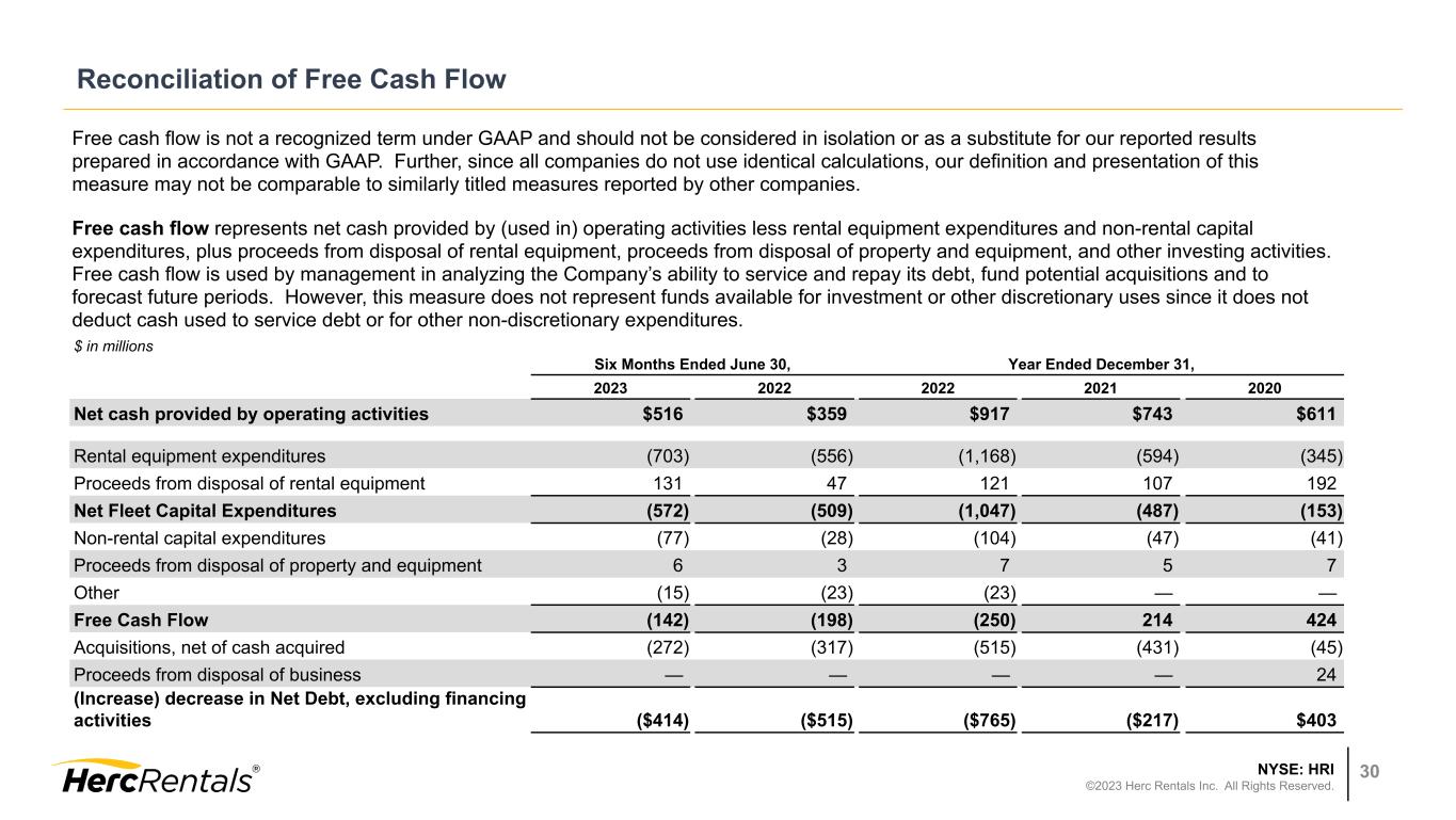 NYSE: HRI ©2023 Herc Rentals Inc. All Rights Reserved. 29 Calculation of Net Leverage Ratio Net Leverage Ratio –The Company has defined its net leverage ratio as net debt, as calculated below, divided by adjusted EBITDA for the trailing twelve-month period. This measure should be considered supplemental to and not a substitute for financial information prepared in accordance with GAAP. The Company’s definition of this measure may differ from similarly titled measures used by other companies. $ in millions Q1 2022 Q2 2022 Q3 2022 Q4 2022 Q1 2023 Q2 2023 Long-Term Debt, Net $2,142 $2,503 $2,762 $2,922 $3,215 $3,493 (Plus) Current maturities of long-term debt 11 11 11 12 12 12 (Plus) Unamortized debt issuance costs 6 6 5 5 5 5 (Less) Cash and Cash Equivalents (23) (52) (57) (54) (40) (37) Net Debt $2,136 $2,468 $2,721 $2,885 $3,192 $3,473 Trailing Twelve-Month Adjusted EBITDA $947 $1,024 $1,123 $1,227 $1,298 $1,366 Net Leverage 2.3x 2.4x 2.4x 2.4x 2.5x 2.5x
