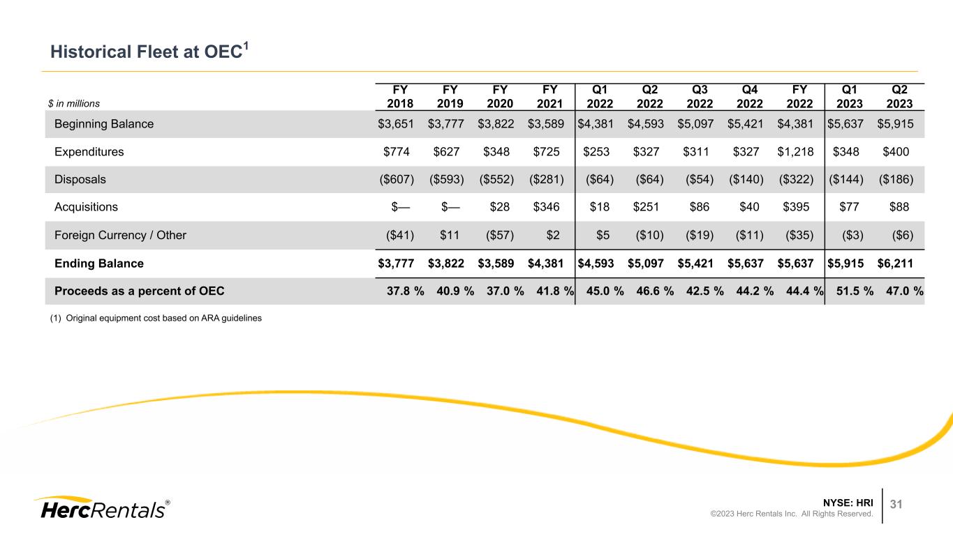 NYSE: HRI ©2023 Herc Rentals Inc. All Rights Reserved. 30 Reconciliation of Free Cash Flow Free cash flow is not a recognized term under GAAP and should not be considered in isolation or as a substitute for our reported results prepared in accordance with GAAP. Further, since all companies do not use identical calculations, our definition and presentation of this measure may not be comparable to similarly titled measures reported by other companies. Free cash flow represents net cash provided by (used in) operating activities less rental equipment expenditures and non-rental capital expenditures, plus proceeds from disposal of rental equipment, proceeds from disposal of property and equipment, and other investing activities. Free cash flow is used by management in analyzing the Company’s ability to service and repay its debt, fund potential acquisitions and to forecast future periods. However, this measure does not represent funds available for investment or other discretionary uses since it does not deduct cash used to service debt or for other non-discretionary expenditures. $ in millions Six Months Ended June 30, Year Ended December 31, 2023 2022 2022 2021 2020 Net cash provided by operating activities $516 $359 $917 $743 $611 Rental equipment expenditures (703) (556) (1,168) (594) (345) Proceeds from disposal of rental equipment 131 47 121 107 192 Net Fleet Capital Expenditures (572) (509) (1,047) (487) (153) Non-rental capital expenditures (77) (28) (104) (47) (41) Proceeds from disposal of property and equipment 6 3 7 5 7 Other (15) (23) (23) — — Free Cash Flow (142) (198) (250) 214 424 Acquisitions, net of cash acquired (272) (317) (515) (431) (45) Proceeds from disposal of business — — — — 24 (Increase) decrease in Net Debt, excluding financing activities ($414) ($515) ($765) ($217) $403