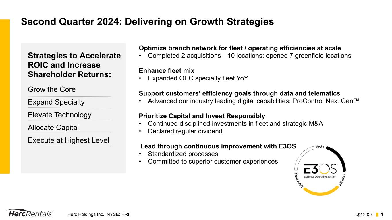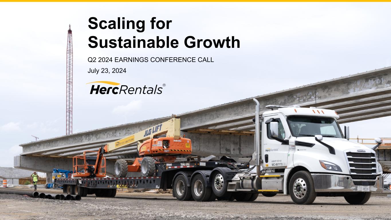 Q2 2024Herc Holdings Inc. NYSE: HRI 3 Safe Harbor Statements and Non-GAAP Financial Measures Forward-Looking Statements This presentation includes forward-looking statements as that term is defined by the federal securities laws, including statements concerning our business plans and strategy, projected profitability, performance or cash flows, future capital expenditures, our growth strategy, including our ability to grow organically and through M&A, anticipated financing needs, business trends, our capital allocation strategy, liquidity and capital management, exploring strategic alternatives for Cinelease, including the timing of the review process, the outcome of the process and the costs and benefits of the process, and other information that is not historical information. Forward looking statements are generally identified by the words "estimates," "expects," "anticipates," "projects," "plans," "intends," "believes," "forecasts," "looks," and future or conditional verbs, such as "will," "should," "could" or "may," as well as variations of such words or similar expressions. All forward- looking statements are based upon our current expectations and various assumptions and, there can be no assurance that our current expectations will be achieved. They are subject to future events, risks and uncertainties - many of which are beyond our control - as well as potentially inaccurate assumptions, that could cause actual results to differ materially from those in the forward-looking statements. Further information on the risks that may affect our business is included in filings we make with the Securities and Exchange Commission from time to time, including our most recent annual report on Form 10-K, subsequent quarterly reports on Form 10-Q, and in our other SEC filings. We undertake no obligation to update or revise forward- looking statements that have been made to reflect events or circumstances that arise after the date made or to reflect the occurrence of unanticipated events. Information Regarding Non-GAAP Financial Measures In addition to results calculated according to accounting principles generally accepted in the United States (“GAAP”), the Company has provided certain information in this presentation that is not calculated according to GAAP (“non-GAAP”), such as adjusted net income, adjusted earnings per diluted share, EBITDA, adjusted EBITDA, adjusted EBITDA margin, REBITDA, REBITDA margin, REBITDA flow-through and free cash flow. Additionally, certain results are presented excluding the Cinelease studio entertainment business. Management uses these non-GAAP measures to evaluate operating performance and period-over-period performance of our core business without regard to potential distortions, and believes that investors will likewise find these non-GAAP measures useful in evaluating the Company’s performance. These measures are frequently used by security analysts, institutional investors and other interested parties in the evaluation of companies in our industry. Non-GAAP measures should not be considered in isolation or as a substitute for our reported results prepared in accordance with GAAP and, as calculated, may not be comparable to similarly titled measures of other companies. For the definitions of these terms, further information about management’s use of these measures as well as a reconciliation of these non-GAAP measures to the most comparable GAAP financial measures, please see the appendix that accompanies this presentation.