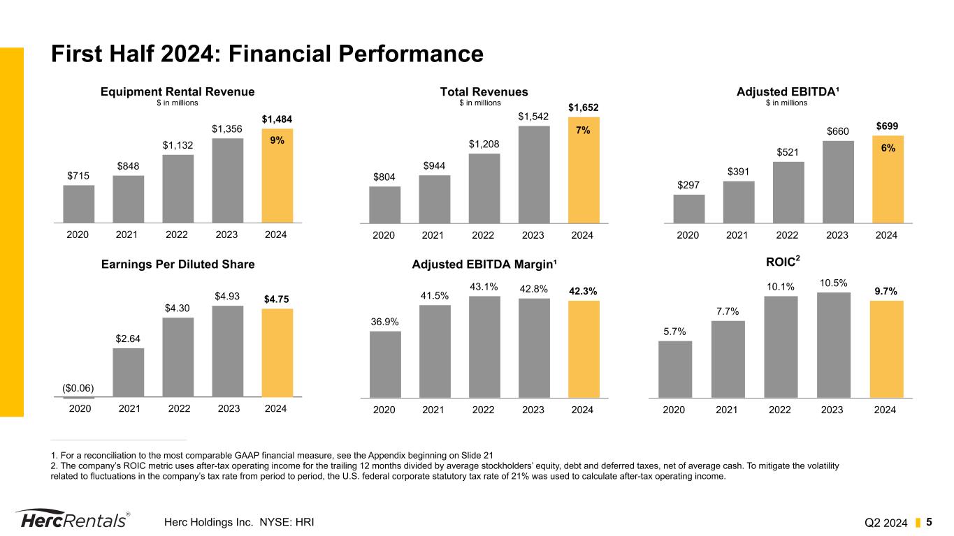 Q2 2024Herc Holdings Inc. NYSE: HRI 4 Second Quarter 2024: Delivering on Growth Strategies Optimize branch network for fleet / operating efficiencies at scale • Completed 2 acquisitions—10 locations; opened 7 greenfield locations Enhance fleet mix • Expanded OEC specialty fleet YoY Support customers’ efficiency goals through data and telematics • Advanced our industry leading digital capabilities: ProControl Next Gen™ Prioritize Capital and Invest Responsibly • Continued disciplined investments in fleet and strategic M&A • Declared regular dividend Lead through continuous improvement with E3OS • Standardized processes • Committed to superior customer experiences Strategies to Accelerate ROIC and Increase Shareholder Returns: Grow the Core Expand Specialty Elevate Technology Allocate Capital Execute at Highest Level
