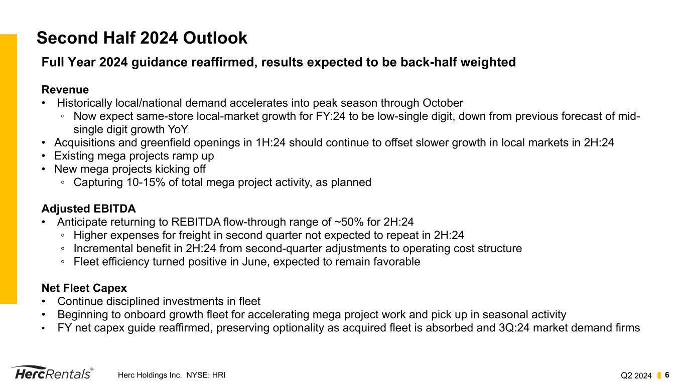 Q2 2024Herc Holdings Inc. NYSE: HRI 5 First Half 2024: Financial Performance 1. For a reconciliation to the most comparable GAAP financial measure, see the Appendix beginning on Slide 21 2. The company’s ROIC metric uses after-tax operating income for the trailing 12 months divided by average stockholders’ equity, debt and deferred taxes, net of average cash. To mitigate the volatility related to fluctuations in the company’s tax rate from period to period, the U.S. federal corporate statutory tax rate of 21% was used to calculate after-tax operating income. Equipment Rental Revenue $715 $848 $1,132 $1,356 $1,484 2020 2021 2022 2023 2024 9% $ in millions Total Revenues $804 $944 $1,208 $1,542 $1,652 2020 2021 2022 2023 2024 Adjusted EBITDA¹ $297 $391 $521 $660 $699 2020 2021 2022 2023 2024 7% 6% $ in millions $ in millions Earnings Per Diluted Share $2.64 $4.30 $4.93 $4.75 Adjusted EBITDA Margin¹ 36.9% 41.5% 43.1% 42.8% 42.3% 2020 2021 2022 2023 2024 5.7% 7.7% 10.1% 10.5% 9.7% 2020 2021 2022 2023 2024 ROIC2 2020 2021 2022 2023 2024 ($0.06)