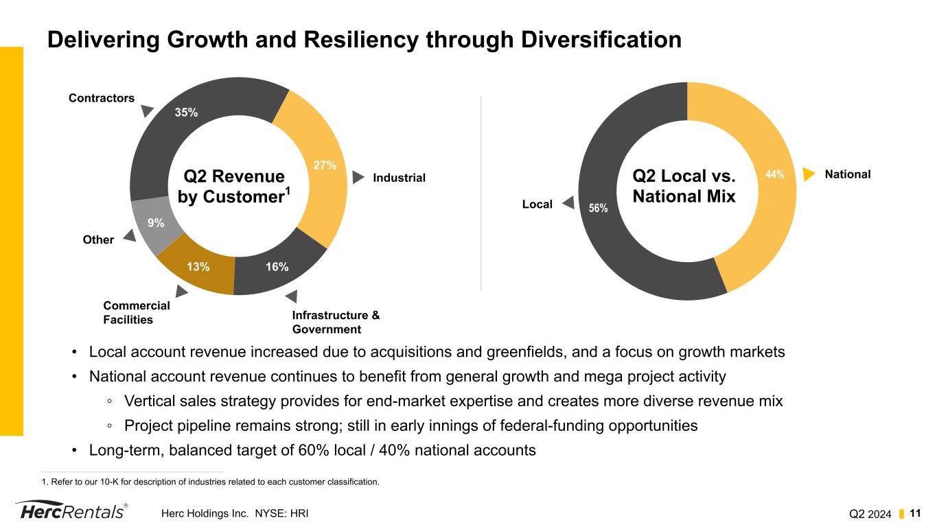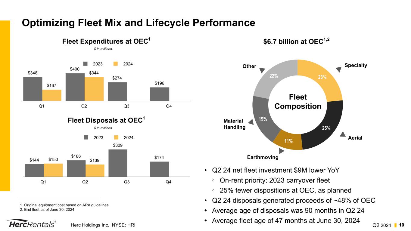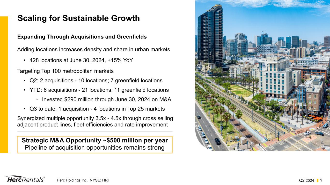Q2 2024Herc Holdings Inc. NYSE: HRI 9 Scaling for Sustainable Growth Expanding Through Acquisitions and Greenfields Adding locations increases density and share in urban markets • 428 locations at June 30, 2024, +15% YoY Targeting Top 100 metropolitan markets • Q2: 2 acquisitions - 10 locations; 7 greenfield locations • YTD: 6 acquisitions - 21 locations; 11 greenfield locations ◦ Invested $290 million through June 30, 2024 on M&A • Q3 to date: 1 acquisition - 4 locations in Top 25 markets Synergized multiple opportunity 3.5x - 4.5x through cross selling adjacent product lines, fleet efficiencies and rate improvement Strategic M&A Opportunity ~$500 million per year Pipeline of acquisition opportunities remains strong