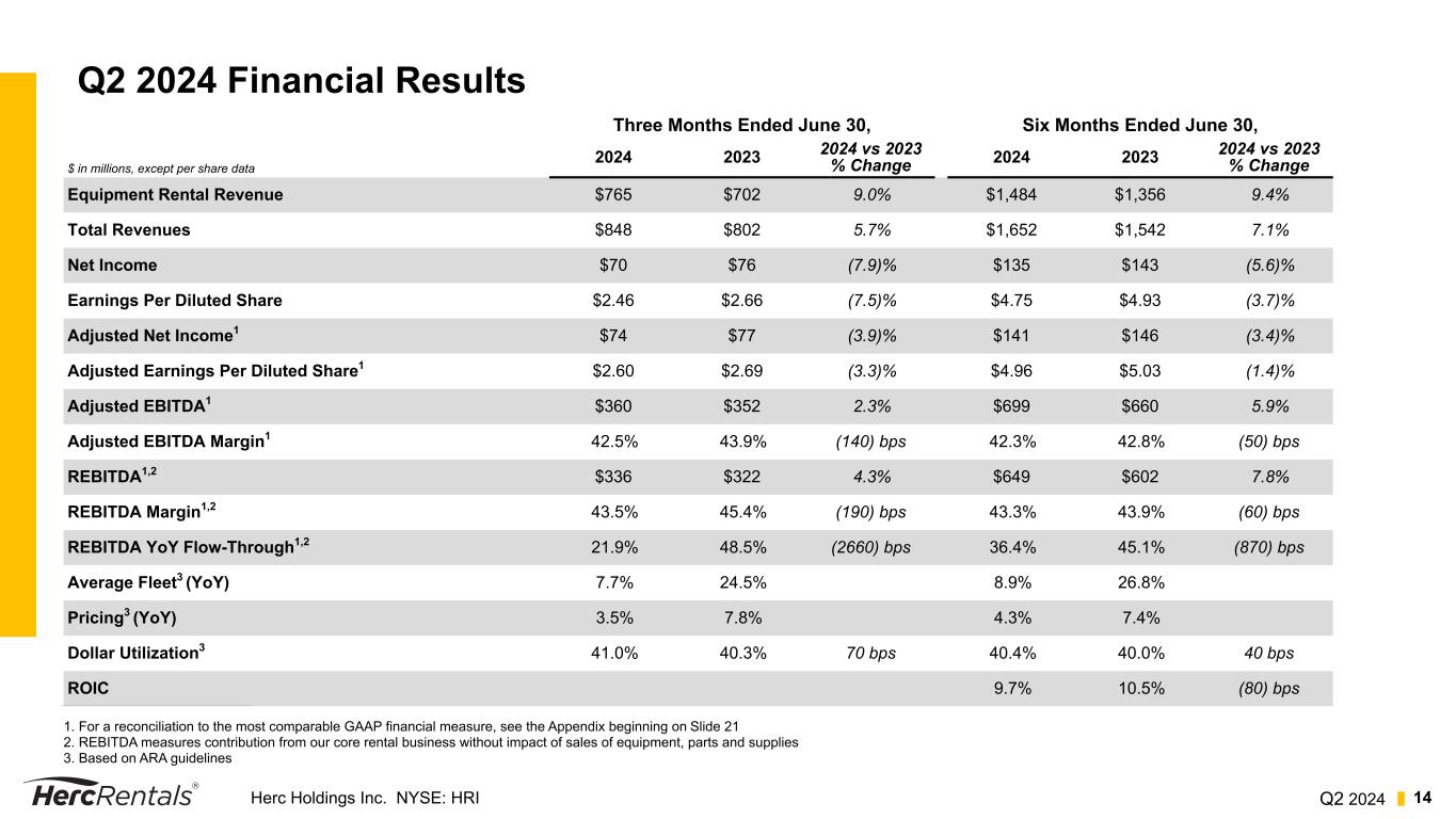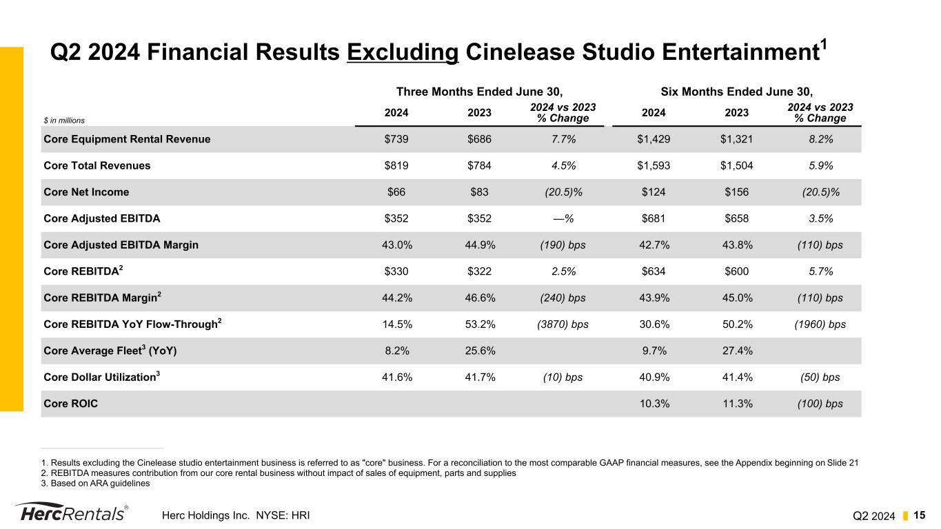 Q2 2024Herc Holdings Inc. NYSE: HRI 14 Q2 2024 Financial Results 1. For a reconciliation to the most comparable GAAP financial measure, see the Appendix beginning on Slide 21 2. REBITDA measures contribution from our core rental business without impact of sales of equipment, parts and supplies 3. Based on ARA guidelines Three Months Ended June 30, Six Months Ended June 30, $ in millions, except per share data 2024 2023 2024 vs 2023 % Change 2024 2023 2024 vs 2023 % Change Equipment Rental Revenue $765 $702 9.0% $1,484 $1,356 9.4% Total Revenues $848 $802 5.7% $1,652 $1,542 7.1% Net Income $70 $76 (7.9)% $135 $143 (5.6)% Earnings Per Diluted Share $2.46 $2.66 (7.5)% $4.75 $4.93 (3.7)% Adjusted Net Income1 $74 $77 (3.9)% $141 $146 (3.4)% Adjusted Earnings Per Diluted Share1 $2.60 $2.69 (3.3)% $4.96 $5.03 (1.4)% Adjusted EBITDA1 $360 $352 2.3% $699 $660 5.9% Adjusted EBITDA Margin1 42.5% 43.9% (140) bps 42.3% 42.8% (50) bps REBITDA1,2 $336 $322 4.3% $649 $602 7.8% REBITDA Margin1,2 43.5% 45.4% (190) bps 43.3% 43.9% (60) bps REBITDA YoY Flow-Through1,2 21.9% 48.5% (2660) bps 36.4% 45.1% (870) bps Average Fleet3 (YoY) 7.7% 24.5% 8.9% 26.8% Pricing3 (YoY) 3.5% 7.8% 4.3% 7.4% Dollar Utilization3 41.0% 40.3% 70 bps 40.4% 40.0% 40 bps ROIC 9.7% 10.5% (80) bps