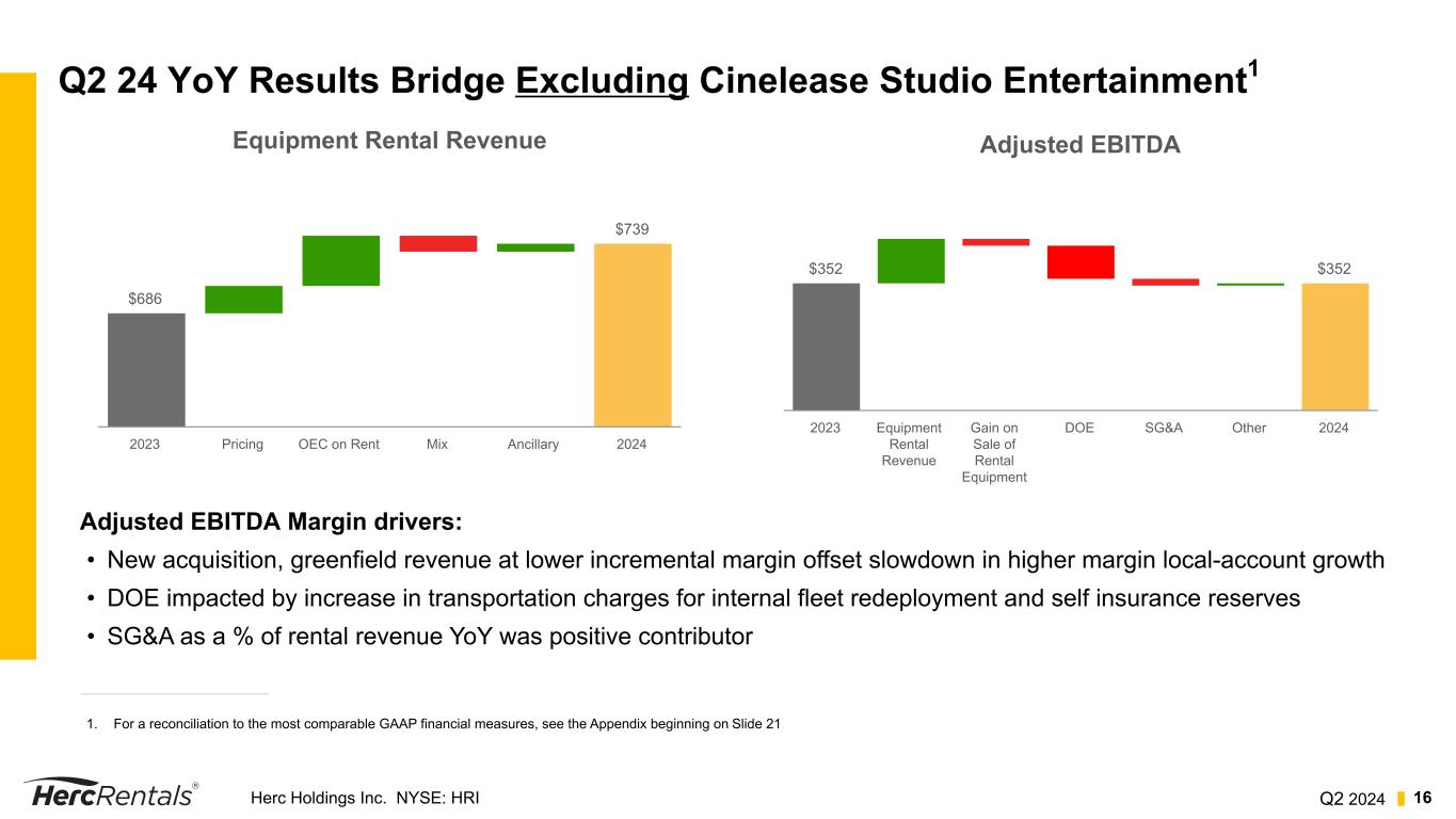 Q2 2024Herc Holdings Inc. NYSE: HRI 15 Q2 2024 Financial Results Excluding Cinelease Studio Entertainment1 1. Results excluding the Cinelease studio entertainment business is referred to as "core" business. For a reconciliation to the most comparable GAAP financial measures, see the Appendix beginning on Slide 21 2. REBITDA measures contribution from our core rental business without impact of sales of equipment, parts and supplies 3. Based on ARA guidelines Three Months Ended June 30, Six Months Ended June 30, $ in millions 2024 2023 2024 vs 2023 % Change 2024 2023 2024 vs 2023 % Change Core Equipment Rental Revenue $739 $686 7.7% $1,429 $1,321 8.2% Core Total Revenues $819 $784 4.5% $1,593 $1,504 5.9% Core Net Income $66 $83 (20.5)% $124 $156 (20.5)% Core Adjusted EBITDA $352 $352 —% $681 $658 3.5% Core Adjusted EBITDA Margin 43.0% 44.9% (190) bps 42.7% 43.8% (110) bps Core REBITDA2 $330 $322 2.5% $634 $600 5.7% Core REBITDA Margin2 44.2% 46.6% (240) bps 43.9% 45.0% (110) bps Core REBITDA YoY Flow-Through2 14.5% 53.2% (3870) bps 30.6% 50.2% (1960) bps Core Average Fleet3 (YoY) 8.2% 25.6% 9.7% 27.4% Core Dollar Utilization3 41.6% 41.7% (10) bps 40.9% 41.4% (50) bps Core ROIC 10.3% 11.3% (100) bps