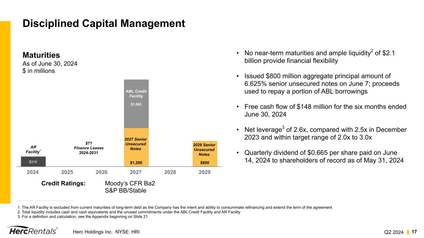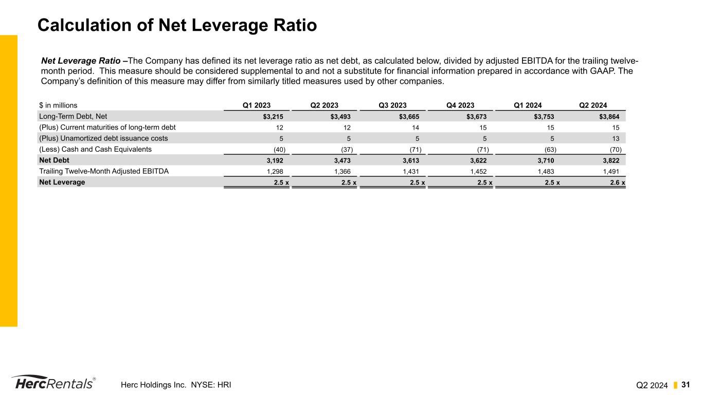 Q2 2024Herc Holdings Inc. NYSE: HRI 31 Calculation of Net Leverage Ratio $ in millions Q1 2023 Q2 2023 Q3 2023 Q4 2023 Q1 2024 Q2 2024 Long-Term Debt, Net $3,215 $3,493 $3,665 $3,673 $3,753 $3,864 (Plus) Current maturities of long-term debt 12 12 14 15 15 15 (Plus) Unamortized debt issuance costs 5 5 5 5 5 13 (Less) Cash and Cash Equivalents (40) (37) (71) (71) (63) (70) Net Debt 3,192 3,473 3,613 3,622 3,710 3,822 Trailing Twelve-Month Adjusted EBITDA 1,298 1,366 1,431 1,452 1,483 1,491 Net Leverage 2.5 x 2.5 x 2.5 x 2.5 x 2.5 x 2.6 x Net Leverage Ratio –The Company has defined its net leverage ratio as net debt, as calculated below, divided by adjusted EBITDA for the trailing twelve- month period. This measure should be considered supplemental to and not a substitute for financial information prepared in accordance with GAAP. The Company’s definition of this measure may differ from similarly titled measures used by other companies.