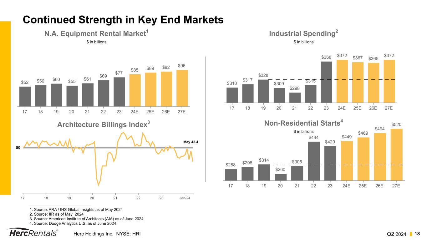 Q2 2024Herc Holdings Inc. NYSE: HRI 18 Continued Strength in Key End Markets 1. Source: ARA / IHS Global Insights as of May 2024 2. Source: IIR as of May 2024 3. Source: American Institute of Architects (AIA) as of June 2024 4. Source: Dodge Analytics U.S. as of June 2024 N.A. Equipment Rental Market1 $52 $56 $60 $55 $61 $69 $77 $85 $89 $92 $96 17 18 19 20 21 22 23 24E 25E 26E 27E $ in billions Industrial Spending2 $310 $317 $328 $309 $298 $315 $368 $372 $367 $365 $372 17 18 19 20 21 22 23 24E 25E 26E 27E $ in billions Non-Residential Starts4 $288 $298 $314 $260 $305 $444 $420 $449 $469 $494 $520 17 18 19 20 21 22 23 24E 25E 26E 27E $ in billions — — — — — — — — — — — — — — — — — — — — — — — — — — — — — — — — — — — — — Architecture Billings Index3 17 18 19 20 21 22 23 Jan-24 50 May 42.4