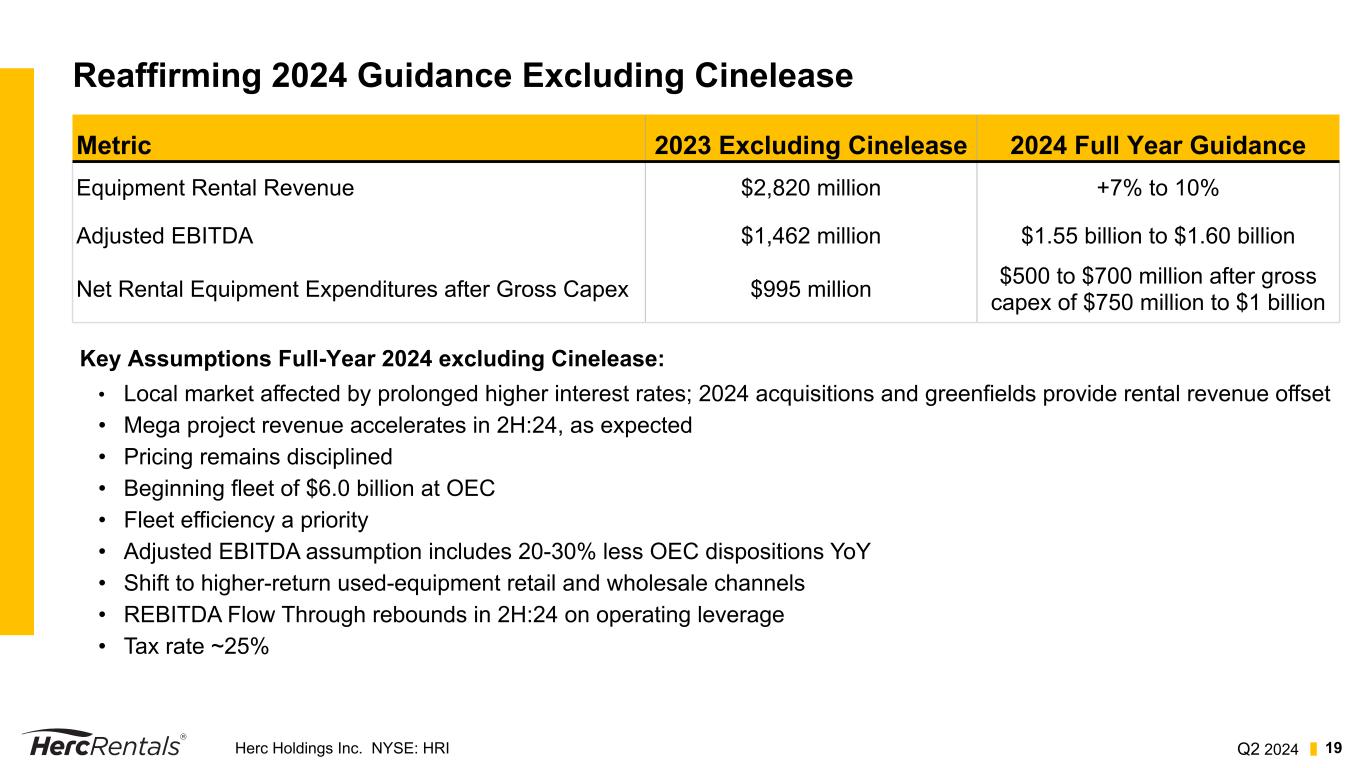 Q2 2024Herc Holdings Inc. NYSE: HRI 24 Reconciliation of Net Income to Adj. EBITDA and Adj. EBITDA Margin, Rental Adj. EBITDA (REBITDA), REBITDA Margin and Flow-Through EBITDA, Adjusted EBITDA, and REBITDA—EBITDA represents the sum of net income, provision (benefit) for income taxes, interest expense, net, depreciation of rental equipment and non-rental depreciation and amortization. Adjusted EBITDA represents EBITDA plus the sum of transaction related costs, restructuring and restructuring related charges, spin-off costs, non-cash stock based compensation charges, loss on extinguishment of debt (which is included in interest expense, net), impairment charges, gain (loss) on disposal of a business and certain other items. REBITDA represents Adjusted EBITDA excluding the gain (loss) on sales of rental equipment and new equipment, parts and supplies. EBITDA, Adjusted EBITDA and REBITDA do not purport to be alternatives to net income as an indicator of operating performance. Additionally, none of these measures purports to be an alternative to cash flows from operating activities as a measure of liquidity, as they do not consider certain cash requirements such as interest payments and tax payments. Adjusted EBITDA Margin, REBITDA Margin and REBITDA Flow-Through—Adjusted EBITDA Margin (Adjusted EBITDA / Total Revenues) is a commonly used profitability ratio. REBITDA Margin (REBITDA / Equipment rental, service and other revenues) and REBITDA Flow- Through (the year-over-year change in REBITDA/the year-over-year change in Equipment rental, service, and other revenues) are useful operating profitability ratios to management and investors. EBITDA, Adjusted EBITDA, REBITDA, Adjusted EBITDA Margin, REBITDA Margin and REBITDA Flow-Through Excluding Studio Entertainment—On slides 26 and 27, each metric has been adjusted to exclude the studio entertainment business due to the intent to sell that business and provides the operating performance of the remaining business.