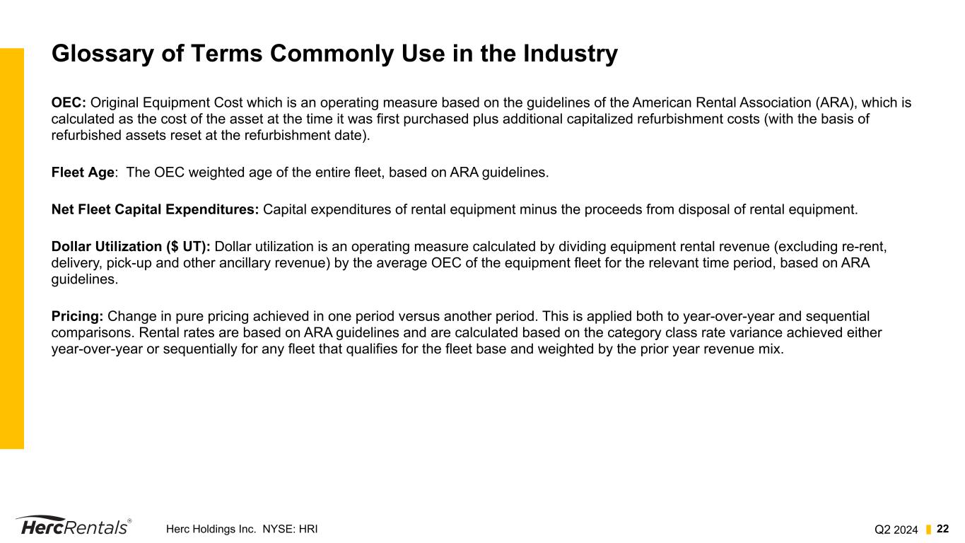 Q2 2024Herc Holdings Inc. NYSE: HRI 22 Glossary of Terms Commonly Use in the Industry OEC: Original Equipment Cost which is an operating measure based on the guidelines of the American Rental Association (ARA), which is calculated as the cost of the asset at the time it was first purchased plus additional capitalized refurbishment costs (with the basis of refurbished assets reset at the refurbishment date). Fleet Age: The OEC weighted age of the entire fleet, based on ARA guidelines. Net Fleet Capital Expenditures: Capital expenditures of rental equipment minus the proceeds from disposal of rental equipment. Dollar Utilization ($ UT): Dollar utilization is an operating measure calculated by dividing equipment rental revenue (excluding re-rent, delivery, pick-up and other ancillary revenue) by the average OEC of the equipment fleet for the relevant time period, based on ARA guidelines. Pricing: Change in pure pricing achieved in one period versus another period. This is applied both to year-over-year and sequential comparisons. Rental rates are based on ARA guidelines and are calculated based on the category class rate variance achieved either year-over-year or sequentially for any fleet that qualifies for the fleet base and weighted by the prior year revenue mix.