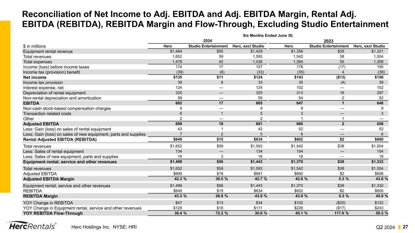 Q2 2024Herc Holdings Inc. NYSE: HRI 26 Reconciliation of Net Income to Adj. EBITDA and Adj. EBITDA Margin, Rental Adj. EBITDA (REBITDA), REBITDA Margin and Flow-Through, Excluding Studio Entertainment Three Months Ended June 30, 2024 2023 $ in millions Herc Studio Entertainment Herc, excl Studio Herc Studio Entertainment Herc, excl Studio Equipment rental revenue $765 $26 $739 $702 $16 $686 Total revenues 848 29 819 802 18 784 Total expenses 755 21 734 699 27 672 Income (loss) before income taxes 93 8 85 103 (9) 112 Income tax (provision) benefit (23) (4) (19) (27) 2 (29) Net income $70 $4 $66 $76 ($7) $83 Income tax provision 23 4 19 27 (2) 29 Interest expense, net 63 — 63 54 — 54 Depreciation of rental equipment 165 — 165 161 8 153 Non-rental depreciation and amortization 30 — 30 28 1 27 EBITDA 351 8 343 346 — 346 Non-cash stock-based compensation charges 4 — 4 5 — 5 Transaction related costs 3 — 3 1 — 1 Other 2 — 2 — — — Adjusted EBITDA 360 8 352 352 — 352 Less: Gain (loss) on sales of rental equipment 20 1 19 27 — 27 Less: Gain (loss) on sales of new equipment, parts and supplies 4 1 3 3 — 3 Rental Adjusted EBITDA (REBITDA) $336 $6 $330 $322 $— $322 Total revenues $848 $29 $819 $802 $18 $784 Less: Sales of rental equipment 65 — 65 83 — 83 Less: Sales of new equipment, parts and supplies 10 2 8 10 — 10 Equipment rental, service and other revenues $773 $27 $746 $709 $18 $691 Total revenues $848 $29 $819 $802 $18 $784 Adjusted EBITDA $360 $8 $352 $352 $— $352 Adjusted EBITDA Margin 42.5 % 27.6 % 43.0 % 43.9 % — % 44.9 % Equipment rental, service and other revenues $773 $27 $746 $709 $18 $691 REBITDA $336 $6 $330 $322 $— $322 REBITDA Margin 43.5 % 22.2 % 44.2 % 45.4 % — % 46.6 % YOY Change in REBITDA $14 $6 $8 $47 ($12) $59 YOY Change in Equipment rental, service and other revenues $64 $9 $55 $97 ($14) $111 YOY REBITDA Flow-Through 21.9 % 66.7 % 14.5 % 48.5 % 85.7 % 53.2 %
