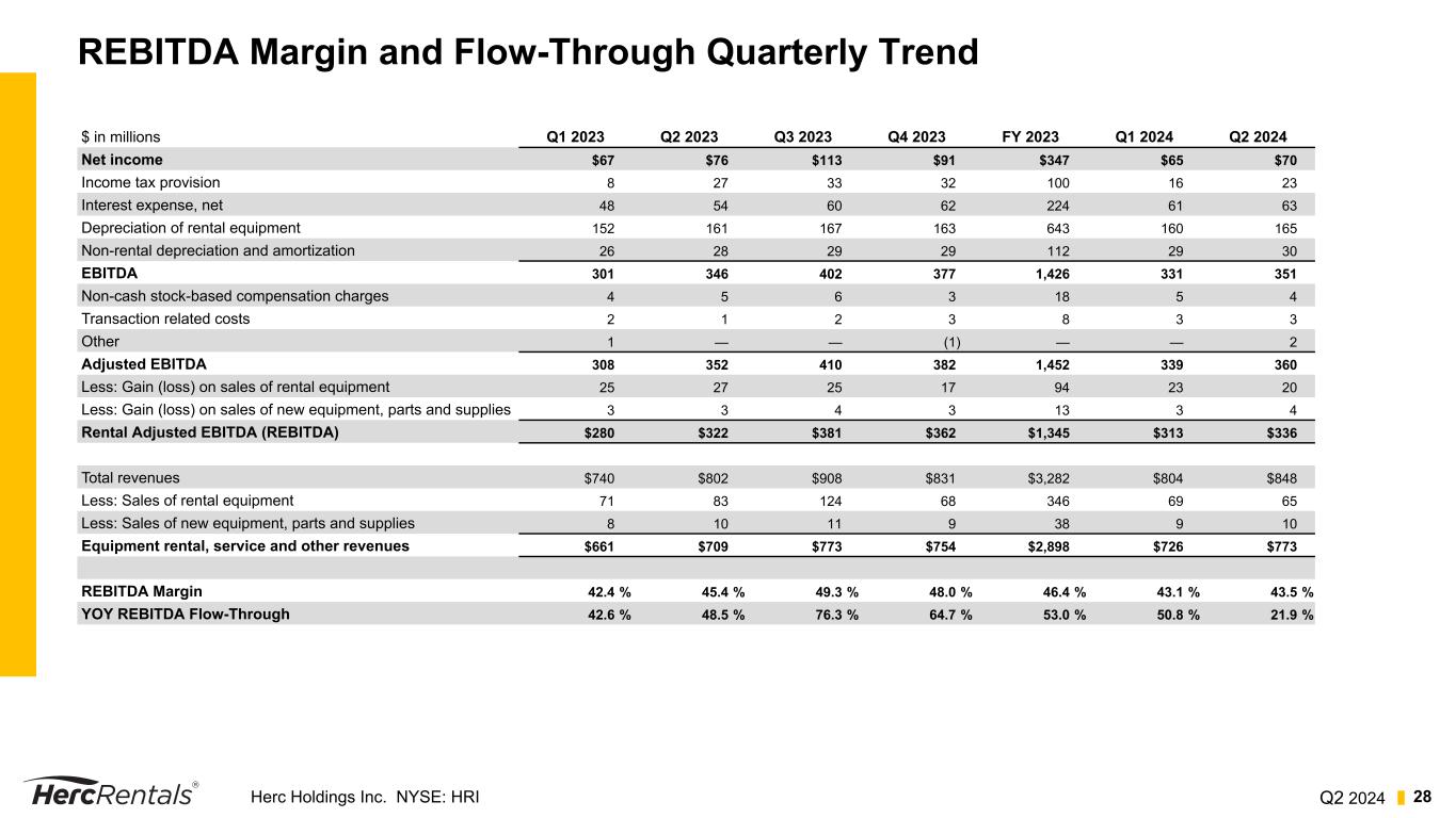 Q2 2024Herc Holdings Inc. NYSE: HRI 27 Reconciliation of Net Income to Adj. EBITDA and Adj. EBITDA Margin, Rental Adj. EBITDA (REBITDA), REBITDA Margin and Flow-Through, Excluding Studio Entertainment Six Months Ended June 30, 2024 2023 $ in millions Herc Studio Entertainment Herc, excl Studio Herc Studio Entertainment Herc, excl Studio Equipment rental revenue $1,484 $55 $1,429 $1,356 $35 $1,321 Total revenues 1,652 59 1,593 1,542 38 1,504 Total expenses 1,478 42 1,436 1,364 55 1,309 Income (loss) before income taxes 174 17 157 178 (17) 195 Income tax (provision) benefit (39) (6) (33) (35) 4 (39) Net income $135 $11 $124 $143 ($13) $156 Income tax provision 39 6 33 35 (4) 39 Interest expense, net 124 — 124 102 — 102 Depreciation of rental equipment 325 — 325 313 16 297 Non-rental depreciation and amortization 59 — 59 54 2 52 EBITDA 682 17 665 647 1 646 Non-cash stock-based compensation charges 9 — 9 9 — 9 Transaction related costs 6 1 5 3 — 3 Other 2 — 2 1 1 — Adjusted EBITDA 699 18 681 660 2 658 Less: Gain (loss) on sales of rental equipment 43 1 42 52 — 52 Less: Gain (loss) on sales of new equipment, parts and supplies 7 2 5 6 — 6 Rental Adjusted EBITDA (REBITDA) $649 $15 $634 $602 $2 $600 Total revenues $1,652 $59 $1,593 $1,542 $38 $1,504 Less: Sales of rental equipment 134 — 134 154 — 154 Less: Sales of new equipment, parts and supplies 19 3 16 18 — 18 Equipment rental, service and other revenues $1,499 $56 $1,443 $1,370 $38 $1,332 Total revenues $1,652 $59 $1,593 $1,542 $38 $1,504 Adjusted EBITDA $699 $18 $681 $660 $2 $658 Adjusted EBITDA Margin 42.3 % 30.5 % 42.7 % 42.8 % 5.3 % 43.8 % Equipment rental, service and other revenues $1,499 $56 $1,443 $1,370 $38 $1,332 REBITDA $649 $15 $634 $602 $2 $600 REBITDA Margin 43.3 % 26.8 % 43.9 % 43.9 % 5.3 % 45.0 % YOY Change in REBITDA $47 $13 $34 $102 ($20) $122 YOY Change in Equipment rental, service and other revenues $129 $18 $111 $226 ($17) $243 YOY REBITDA Flow-Through 36.4 % 72.2 % 30.6 % 45.1 % 117.6 % 50.2 %