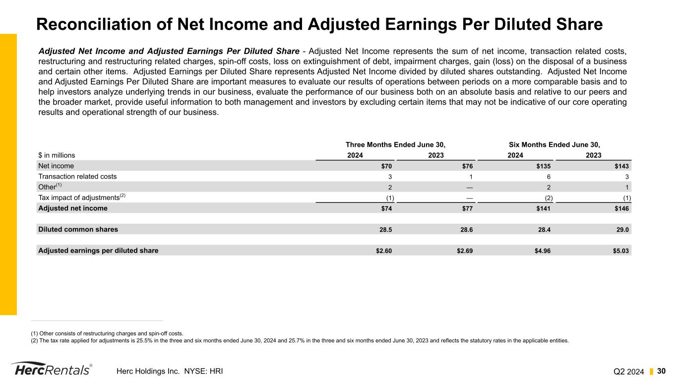 Q2 2024Herc Holdings Inc. NYSE: HRI 30 Reconciliation of Net Income and Adjusted Earnings Per Diluted Share Three Months Ended June 30, Six Months Ended June 30, $ in millions 2024 2023 2024 2023 Net income $70 $76 $135 $143 Transaction related costs 3 1 6 3 Other(1) 2 — 2 1 Tax impact of adjustments(2) (1) — (2) (1) Adjusted net income $74 $77 $141 $146 Diluted common shares 28.5 28.6 28.4 29.0 Adjusted earnings per diluted share $2.60 $2.69 $4.96 $5.03 Adjusted Net Income and Adjusted Earnings Per Diluted Share - Adjusted Net Income represents the sum of net income, transaction related costs, restructuring and restructuring related charges, spin-off costs, loss on extinguishment of debt, impairment charges, gain (loss) on the disposal of a business and certain other items. Adjusted Earnings per Diluted Share represents Adjusted Net Income divided by diluted shares outstanding. Adjusted Net Income and Adjusted Earnings Per Diluted Share are important measures to evaluate our results of operations between periods on a more comparable basis and to help investors analyze underlying trends in our business, evaluate the performance of our business both on an absolute basis and relative to our peers and the broader market, provide useful information to both management and investors by excluding certain items that may not be indicative of our core operating results and operational strength of our business. (1) Other consists of restructuring charges and spin-off costs. (2) The tax rate applied for adjustments is 25.5% in the three and six months ended June 30, 2024 and 25.7% in the three and six months ended June 30, 2023 and reflects the statutory rates in the applicable entities.