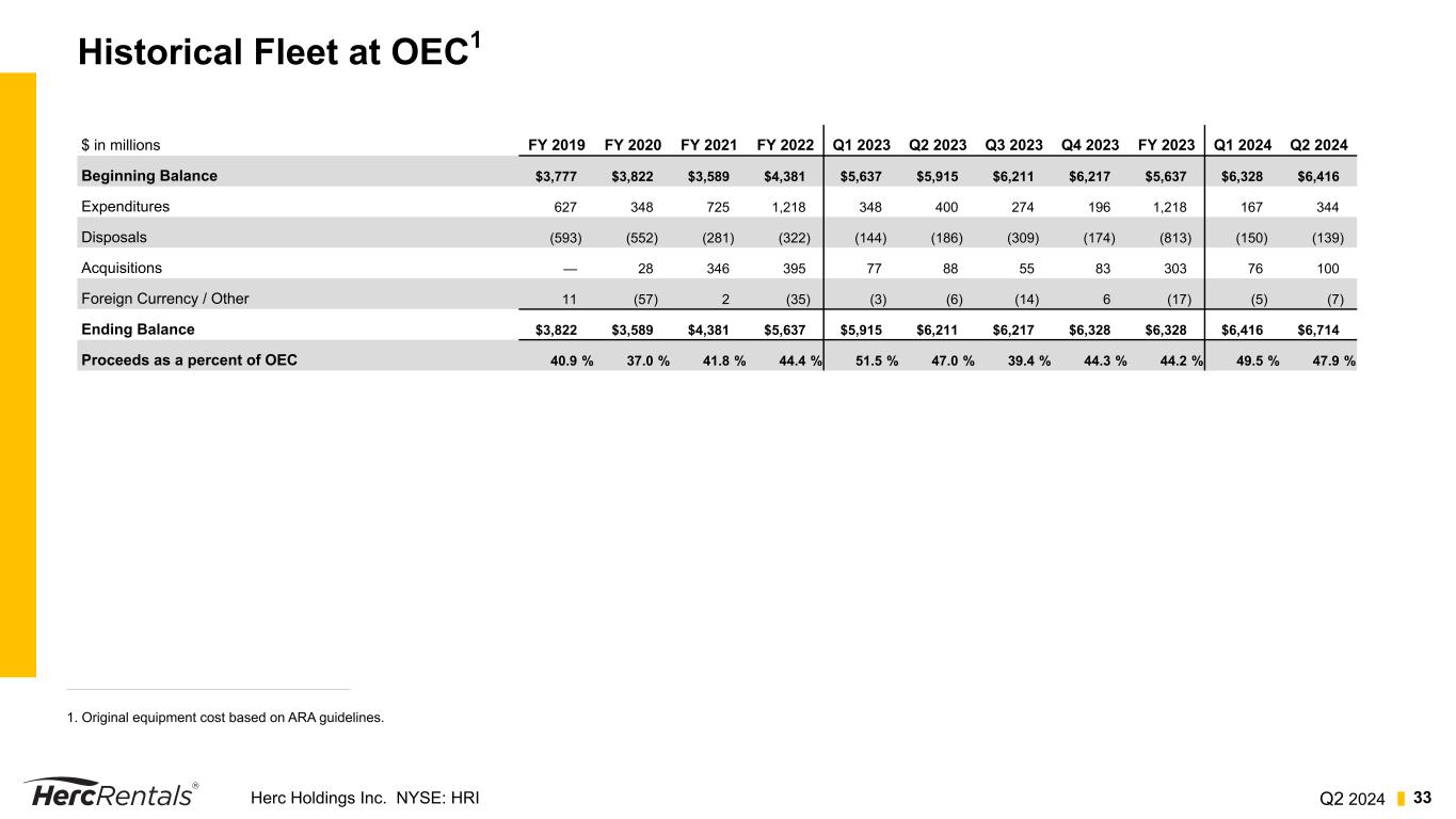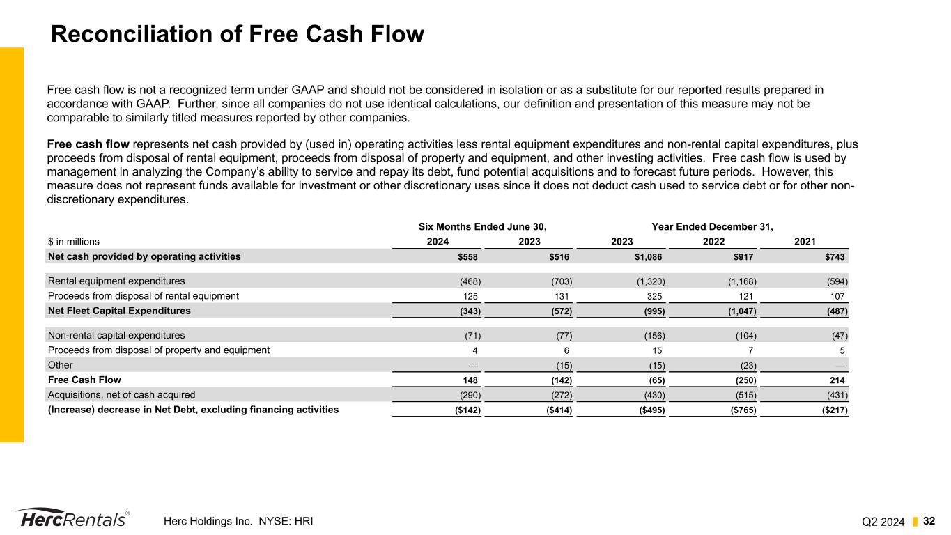 Q2 2024Herc Holdings Inc. NYSE: HRI 32 Reconciliation of Free Cash Flow Six Months Ended June 30, Year Ended December 31, $ in millions 2024 2023 2023 2022 2021 Net cash provided by operating activities $558 $516 $1,086 $917 $743 Rental equipment expenditures (468) (703) (1,320) (1,168) (594) Proceeds from disposal of rental equipment 125 131 325 121 107 Net Fleet Capital Expenditures (343) (572) (995) (1,047) (487) Non-rental capital expenditures (71) (77) (156) (104) (47) Proceeds from disposal of property and equipment 4 6 15 7 5 Other — (15) (15) (23) — Free Cash Flow 148 (142) (65) (250) 214 Acquisitions, net of cash acquired (290) (272) (430) (515) (431) (Increase) decrease in Net Debt, excluding financing activities ($142) ($414) ($495) ($765) ($217) Free cash flow is not a recognized term under GAAP and should not be considered in isolation or as a substitute for our reported results prepared in accordance with GAAP. Further, since all companies do not use identical calculations, our definition and presentation of this measure may not be comparable to similarly titled measures reported by other companies. Free cash flow represents net cash provided by (used in) operating activities less rental equipment expenditures and non-rental capital expenditures, plus proceeds from disposal of rental equipment, proceeds from disposal of property and equipment, and other investing activities. Free cash flow is used by management in analyzing the Company’s ability to service and repay its debt, fund potential acquisitions and to forecast future periods. However, this measure does not represent funds available for investment or other discretionary uses since it does not deduct cash used to service debt or for other non- discretionary expenditures.