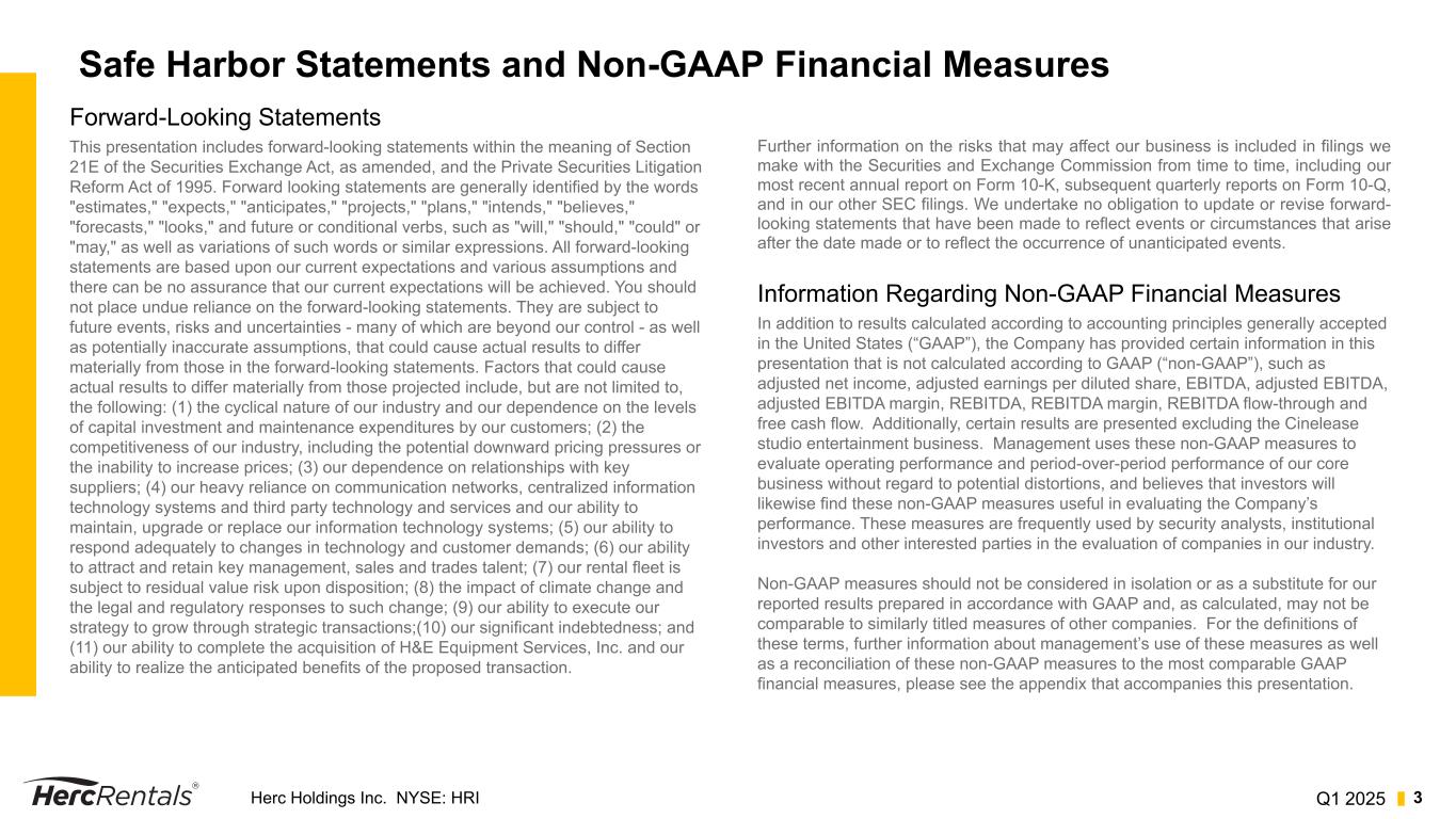 Q1 2025Herc Holdings Inc. NYSE: HRI 2 Herc Rentals Team and Agenda Agenda Safe Harbor Q1 2025 Overview Q1 Operations Review Q1 Financial Review 2025 Outlook Q&ALarry Silber President & Chief Executive Officer Aaron Birnbaum Senior Vice President & Chief Operating Officer Mark Humphrey Senior Vice President & Chief Financial Officer Leslie Hunziker Senior Vice President Investor Relations, Communications & Sustainability