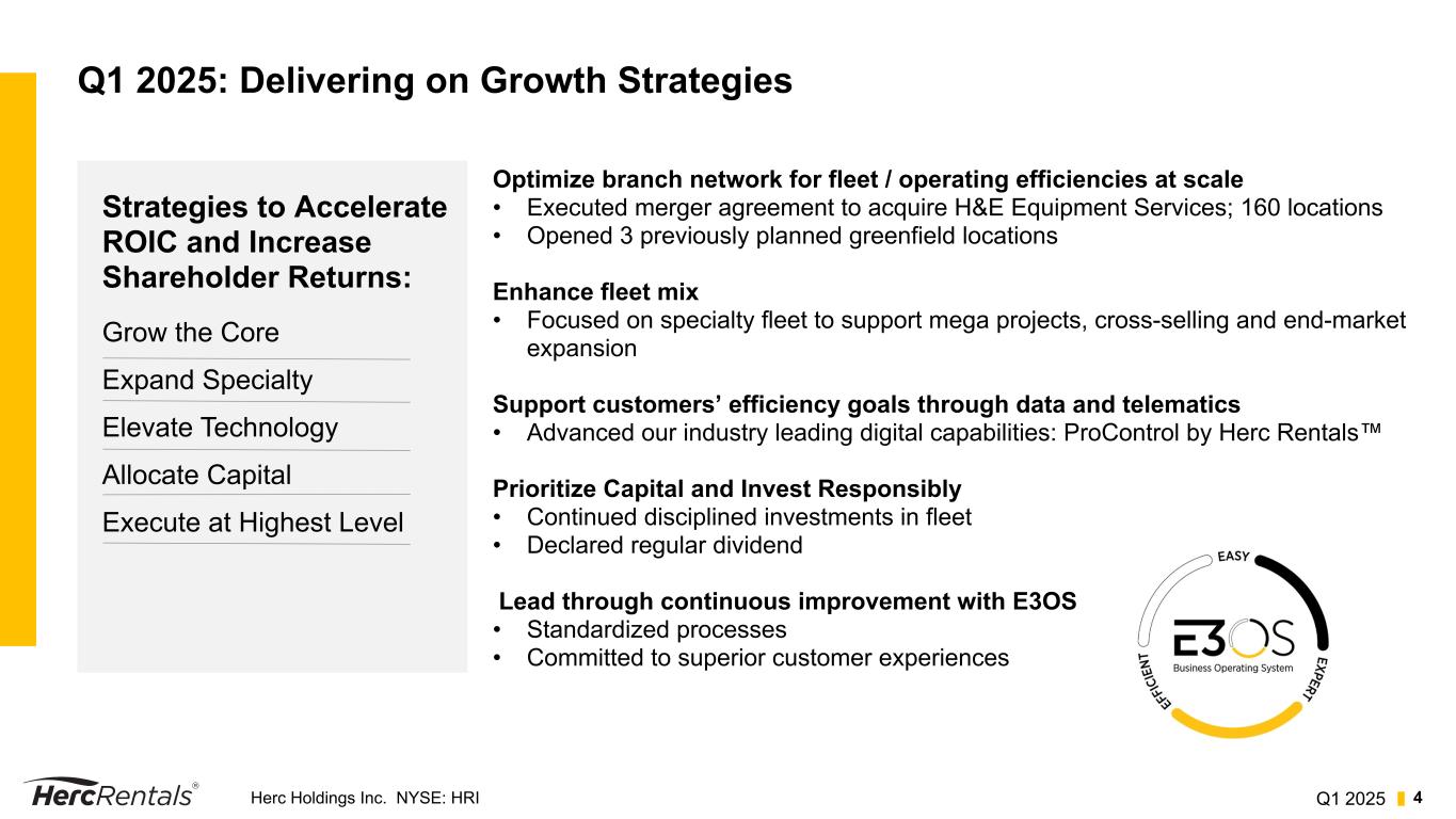 Q1 2025Herc Holdings Inc. NYSE: HRI 3 Safe Harbor Statements and Non-GAAP Financial Measures Forward-Looking Statements This presentation includes forward-looking statements within the meaning of Section 21E of the Securities Exchange Act, as amended, and the Private Securities Litigation Reform Act of 1995. Forward looking statements are generally identified by the words "estimates," "expects," "anticipates," "projects," "plans," "intends," "believes," "forecasts," "looks," and future or conditional verbs, such as "will," "should," "could" or "may," as well as variations of such words or similar expressions. All forward-looking statements are based upon our current expectations and various assumptions and there can be no assurance that our current expectations will be achieved. You should not place undue reliance on the forward-looking statements. They are subject to future events, risks and uncertainties - many of which are beyond our control - as well as potentially inaccurate assumptions, that could cause actual results to differ materially from those in the forward-looking statements. Factors that could cause actual results to differ materially from those projected include, but are not limited to, the following: (1) the cyclical nature of our industry and our dependence on the levels of capital investment and maintenance expenditures by our customers; (2) the competitiveness of our industry, including the potential downward pricing pressures or the inability to increase prices; (3) our dependence on relationships with key suppliers; (4) our heavy reliance on communication networks, centralized information technology systems and third party technology and services and our ability to maintain, upgrade or replace our information technology systems; (5) our ability to respond adequately to changes in technology and customer demands; (6) our ability to attract and retain key management, sales and trades talent; (7) our rental fleet is subject to residual value risk upon disposition; (8) the impact of climate change and the legal and regulatory responses to such change; (9) our ability to execute our strategy to grow through strategic transactions;(10) our significant indebtedness; and (11) our ability to complete the acquisition of H&E Equipment Services, Inc. and our ability to realize the anticipated benefits of the proposed transaction. Further information on the risks that may affect our business is included in filings we make with the Securities and Exchange Commission from time to time, including our most recent annual report on Form 10-K, subsequent quarterly reports on Form 10-Q, and in our other SEC filings. We undertake no obligation to update or revise forward- looking statements that have been made to reflect events or circumstances that arise after the date made or to reflect the occurrence of unanticipated events. Information Regarding Non-GAAP Financial Measures In addition to results calculated according to accounting principles generally accepted in the United States (“GAAP”), the Company has provided certain information in this presentation that is not calculated according to GAAP (“non-GAAP”), such as adjusted net income, adjusted earnings per diluted share, EBITDA, adjusted EBITDA, adjusted EBITDA margin, REBITDA, REBITDA margin, REBITDA flow-through and free cash flow. Additionally, certain results are presented excluding the Cinelease studio entertainment business. Management uses these non-GAAP measures to evaluate operating performance and period-over-period performance of our core business without regard to potential distortions, and believes that investors will likewise find these non-GAAP measures useful in evaluating the Company’s performance. These measures are frequently used by security analysts, institutional investors and other interested parties in the evaluation of companies in our industry. Non-GAAP measures should not be considered in isolation or as a substitute for our reported results prepared in accordance with GAAP and, as calculated, may not be comparable to similarly titled measures of other companies. For the definitions of these terms, further information about management’s use of these measures as well as a reconciliation of these non-GAAP measures to the most comparable GAAP financial measures, please see the appendix that accompanies this presentation.