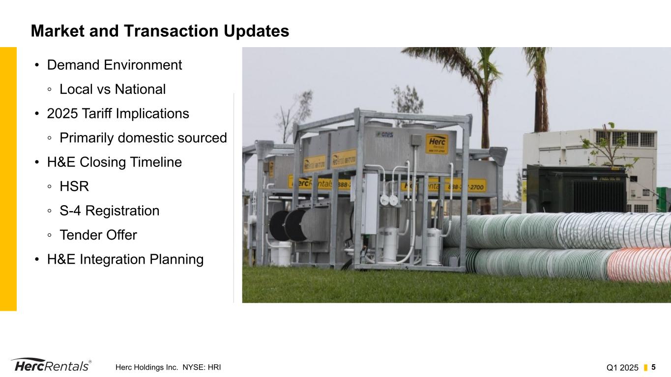 Q1 2025Herc Holdings Inc. NYSE: HRI 4 Q1 2025: Delivering on Growth Strategies Optimize branch network for fleet / operating efficiencies at scale • Executed merger agreement to acquire H&E Equipment Services; 160 locations • Opened 3 previously planned greenfield locations Enhance fleet mix • Focused on specialty fleet to support mega projects, cross-selling and end-market expansion Support customers’ efficiency goals through data and telematics • Advanced our industry leading digital capabilities: ProControl by Herc Rentals™ Prioritize Capital and Invest Responsibly • Continued disciplined investments in fleet • Declared regular dividend Lead through continuous improvement with E3OS • Standardized processes • Committed to superior customer experiences Strategies to Accelerate ROIC and Increase Shareholder Returns: Grow the Core Expand Specialty Elevate Technology Allocate Capital Execute at Highest Level