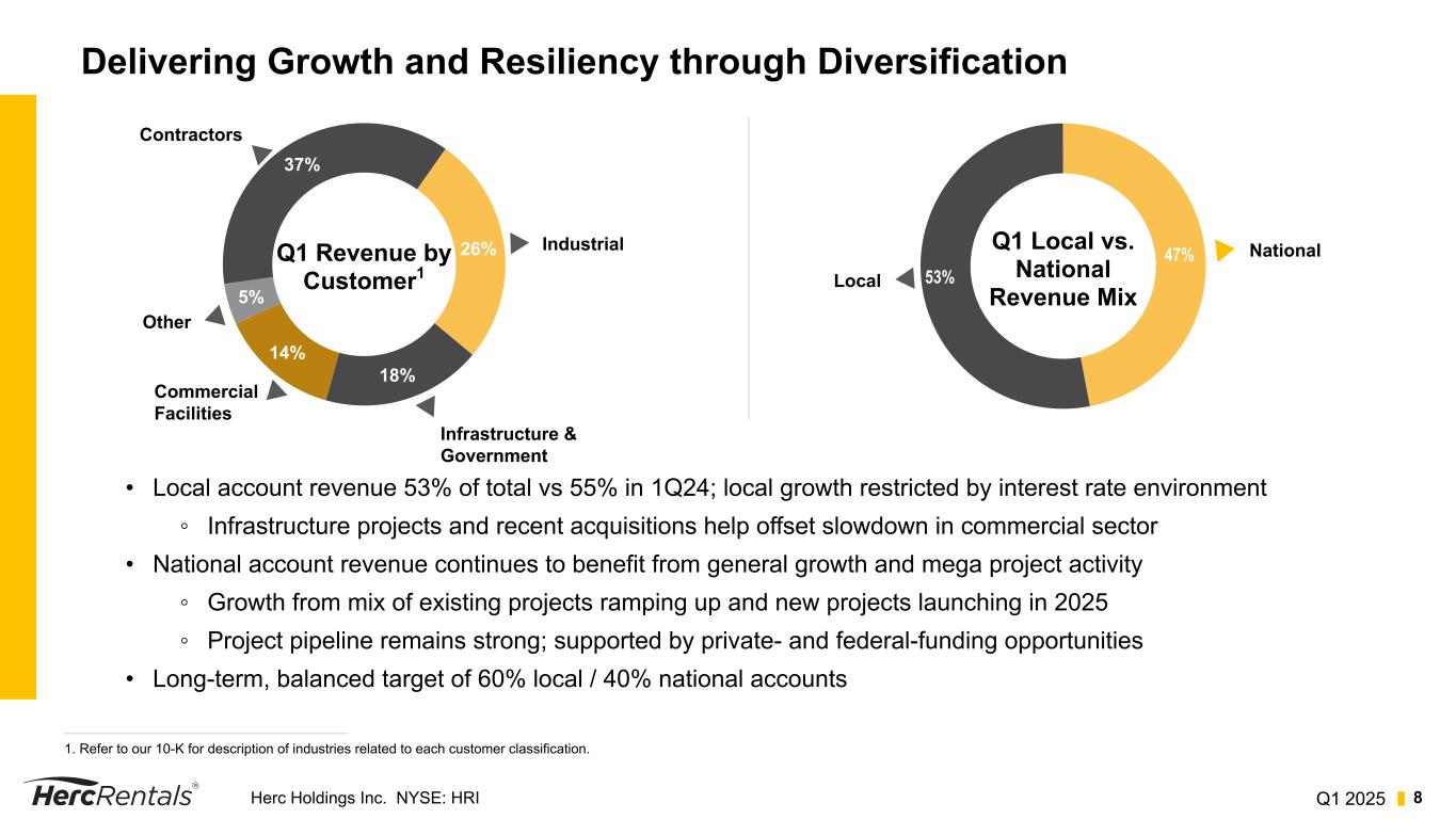 Q1 2025Herc Holdings Inc. NYSE: HRI 7 Focusing on Safety Continuing focus on Perfect Days • Q1 25 all branches reported > 96% Perfect Days • Perfect Days are those with no: • OSHA reportable incidents • At-fault moving vehicle accidents • DOT violations Total TTM Recordable Incident Rate is 0.93 — favorable to industry standard of 1.0 Proven safety record is a must-have for customers Herc's Safety Program is integrated into all acquisitions