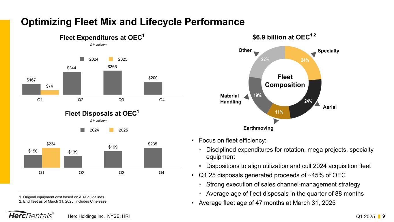 Q1 2025Herc Holdings Inc. NYSE: HRI 8 Delivering Growth and Resiliency through Diversification Q1 Local vs. National Revenue Mix 47% 53% NationalQ1 Revenue by Customer1 37% 26% 18% 14% 5% Local Commercial Facilities Contractors Infrastructure & Government Other Industrial • Local account revenue 53% of total vs 55% in 1Q24; local growth restricted by interest rate environment ◦ Infrastructure projects and recent acquisitions help offset slowdown in commercial sector • National account revenue continues to benefit from general growth and mega project activity ◦ Growth from mix of existing projects ramping up and new projects launching in 2025 ◦ Project pipeline remains strong; supported by private- and federal-funding opportunities • Long-term, balanced target of 60% local / 40% national accounts 1. Refer to our 10-K for description of industries related to each customer classification.