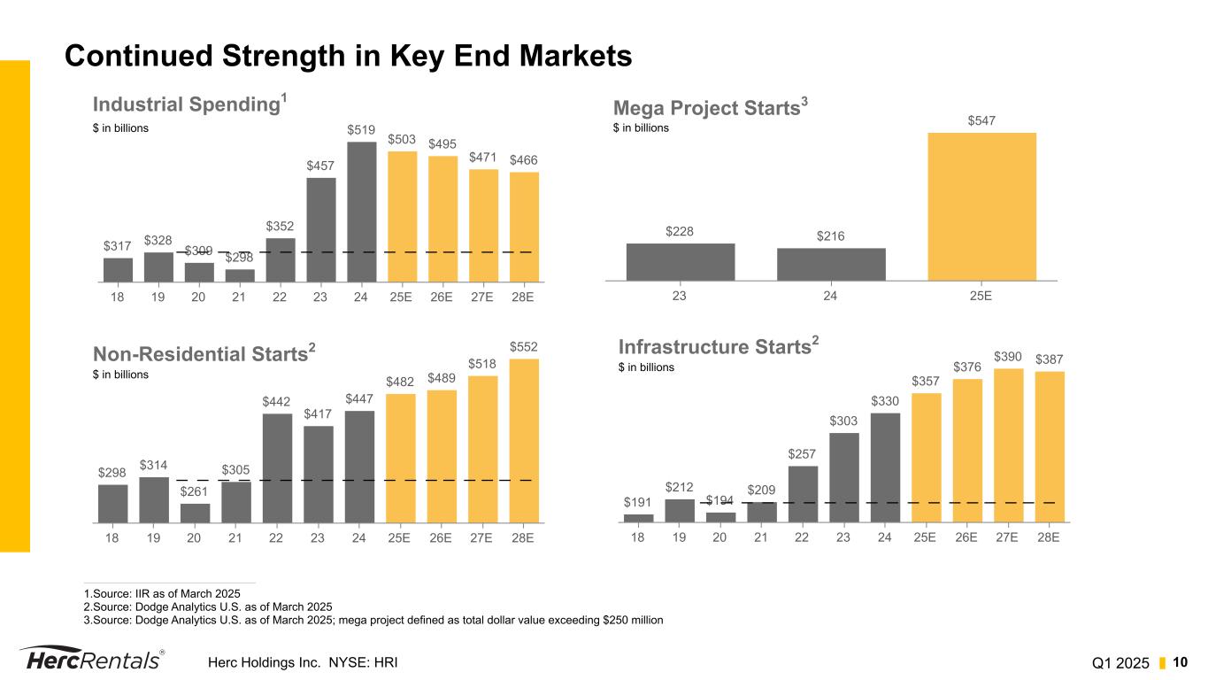 Q1 2025Herc Holdings Inc. NYSE: HRI 9 Optimizing Fleet Mix and Lifecycle Performance 1. Original equipment cost based on ARA guidelines. 2. End fleet as of March 31, 2025, includes Cinelease $167 $344 $366 $200 $74 2024 2025 Q1 Q2 Q3 Q4 Fleet Expenditures at OEC1 $ in millions $150 $139 $199 $235$234 2024 2025 Q1 Q2 Q3 Q4 Fleet Disposals at OEC1 $ in millions 24% 24% 11% 19% 22% • Focus on fleet efficiency: ◦ Disciplined expenditures for rotation, mega projects, specialty equipment ◦ Dispositions to align utilization and cull 2024 acquisition fleet • Q1 25 disposals generated proceeds of ~45% of OEC ◦ Strong execution of sales channel-management strategy ◦ Average age of fleet disposals in the quarter of 88 months • Average fleet age of 47 months at March 31, 2025 $6.9 billion at OEC1,2 Fleet Composition Specialty Aerial Earthmoving Material Handling Other