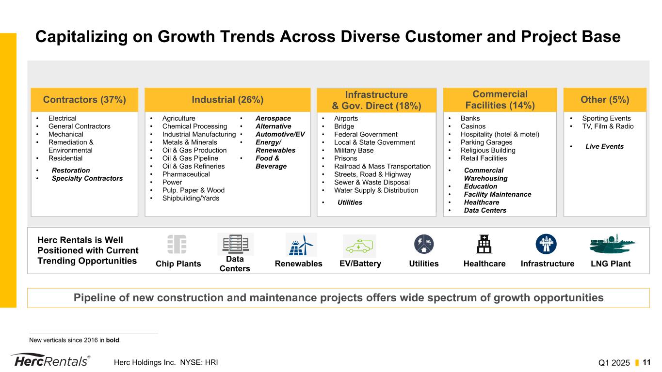 Q1 2025Herc Holdings Inc. NYSE: HRI 10 Continued Strength in Key End Markets 1.Source: IIR as of March 2025 2.Source: Dodge Analytics U.S. as of March 2025 3.Source: Dodge Analytics U.S. as of March 2025; mega project defined as total dollar value exceeding $250 million Industrial Spending1 $317 $328 $309 $298 $352 $457 $519 $503 $495 $471 $466 18 19 20 21 22 23 24 25E 26E 27E 28E $ in billions Non-Residential Starts2 $298 $314 $261 $305 $442 $417 $447 $482 $489 $518 $552 18 19 20 21 22 23 24 25E 26E 27E 28E $ in billions — — — — — — — — — — — — — — — — — — — — — — — — — — — — — — — — — — — — Infrastructure Starts2 $191 $212 $194 $209 $257 $303 $330 $357 $376 $390 $387 18 19 20 21 22 23 24 25E 26E 27E 28E $ in billions — — — — — — — — — — — — — — — — — — Mega Project Starts3 $228 $216 $547 23 24 25E $ in billions