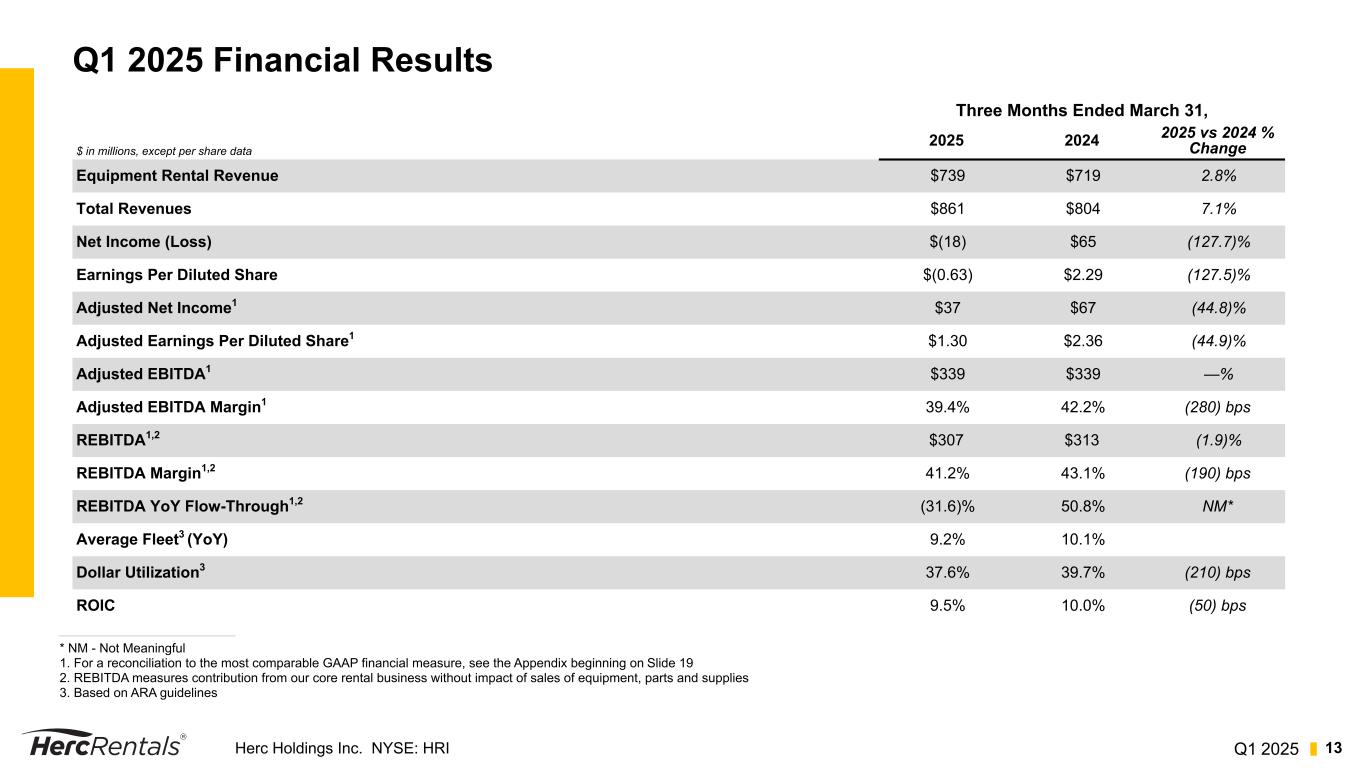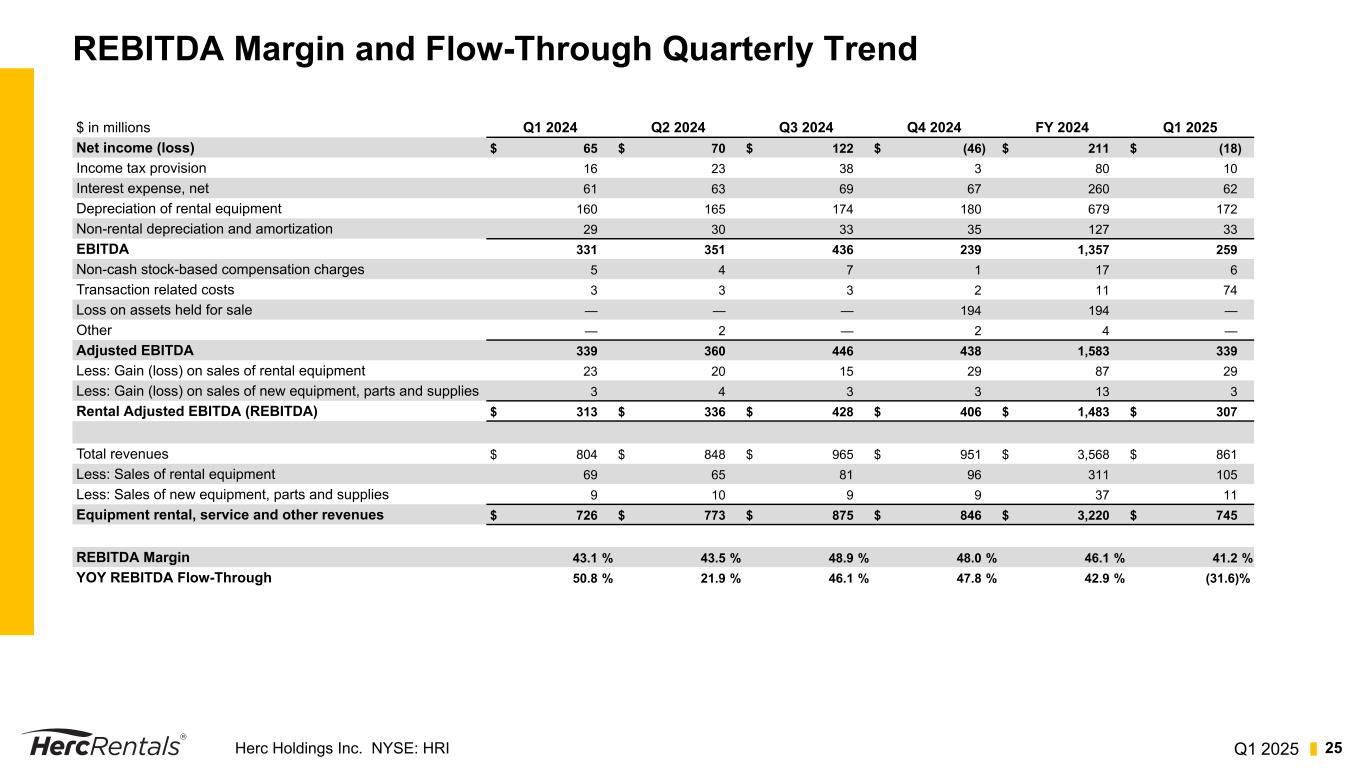 Q1 2025Herc Holdings Inc. NYSE: HRI 24 Reconciliation of Net Income to Adj. EBITDA and Adj. EBITDA Margin, Rental Adj. EBITDA (REBITDA), REBITDA Margin and Flow-Through, Excluding Studio Entertainment Three Months Ended March 31, 2025 2024 $ in millions Herc Studio Entertainment Herc, excl Studio Herc Studio Entertainment Herc, excl Studio Equipment rental revenue $ 739 $ 15 $ 724 $ 719 $ 29 $ 690 Total revenues 861 17 844 804 30 774 Total expenses 869 17 852 723 21 702 Income (loss) before income taxes (8) — (8) 81 9 72 Income tax (provision) benefit (10) — (10) (16) (2) (14) Net income (loss) (18) — (18) 65 7 58 Income tax provision (benefit) 10 — 10 16 2 14 Interest expense, net 62 — 62 61 — 61 Depreciation of rental equipment 172 — 172 160 — 160 Non-rental depreciation and amortization 33 — 33 29 — 29 EBITDA 259 — 259 331 9 322 Non-cash stock-based compensation charges 6 — 6 5 — 5 Transaction related costs 74 1 73 3 1 2 Adjusted EBITDA 339 1 338 339 10 329 Less: Gain (loss) on sales of rental equipment 29 1 28 23 — 23 Less: Gain (loss) on sales of new equipment, parts and supplies 3 — 3 3 1 2 Rental Adjusted EBITDA (REBITDA) $ 307 $ — $ 307 $ 313 $ 9 $ 304 Total revenues $ 861 $ 17 $ 844 $ 804 $ 30 $ 774 Less: Sales of rental equipment 105 1 104 69 — 69 Less: Sales of new equipment, parts and supplies 11 1 10 9 1 8 Equipment rental, service and other revenues $ 745 $ 15 $ 730 $ 726 $ 29 $ 697 Total revenues $ 861 $ 17 $ 844 $ 804 $ 30 $ 774 Adjusted EBITDA $ 339 $ 1 $ 338 $ 339 $ 10 $ 329 Adjusted EBITDA Margin 39.4 % 5.9 % 40.0 % 42.2 % 33.3 % 42.5 % Equipment rental, service and other revenues $ 745 $ 15 $ 730 $ 726 $ 29 $ 697 REBITDA $ 307 $ — $ 307 $ 313 $ 9 $ 304 REBITDA Margin 41.2 % — % 42.1 % 43.1 % 31.0 % 43.6 % YOY Change in REBITDA $ (6) $ (9) $ 3 $ 33 $ 7 $ 26 YOY Change in Equipment rental, service and other revenues $ 19 $ (14) $ 33 $ 65 $ 9 $ 56 YOY REBITDA Flow-Through (31.6) % 64.3 % 9.1 % 50.8 % 77.8 % 46.4 %