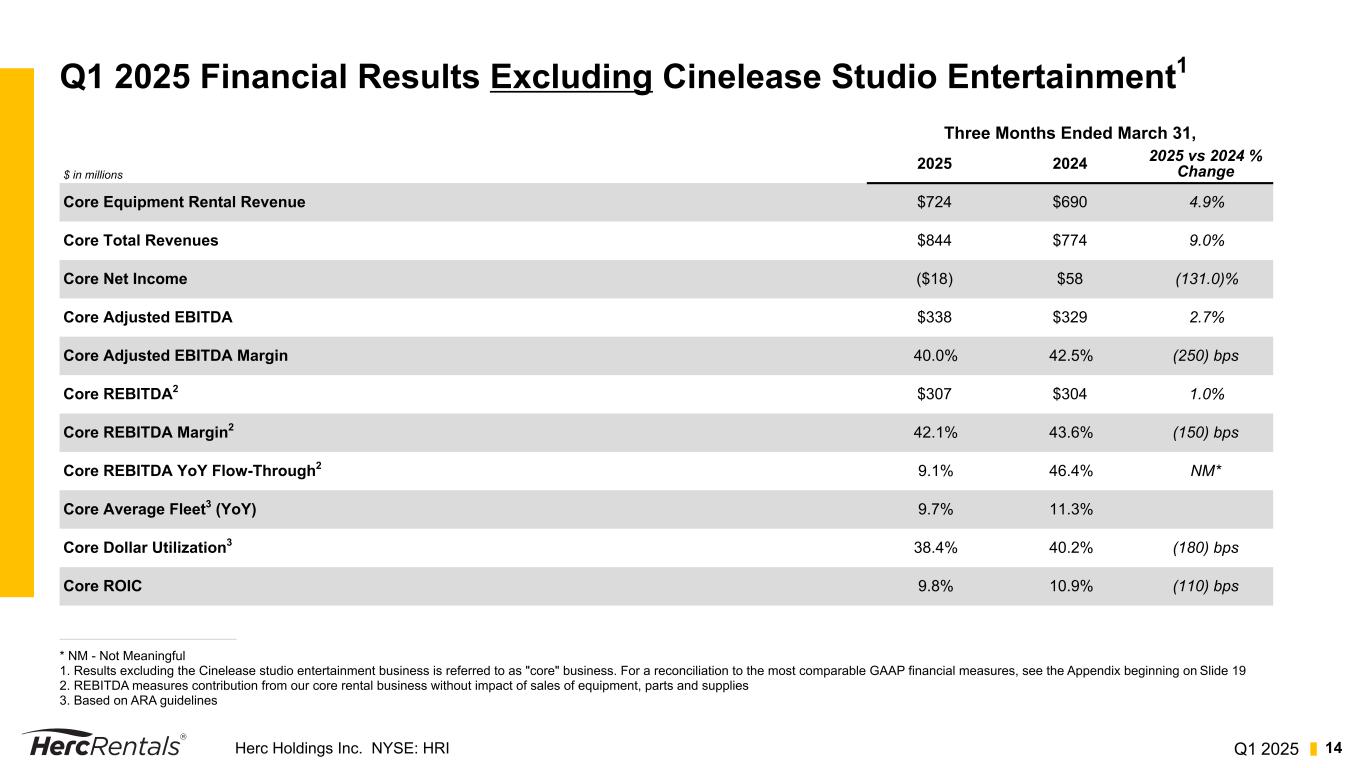 Q1 2025Herc Holdings Inc. NYSE: HRI 13 Q1 2025 Financial Results * NM - Not Meaningful 1. For a reconciliation to the most comparable GAAP financial measure, see the Appendix beginning on Slide 19 2. REBITDA measures contribution from our core rental business without impact of sales of equipment, parts and supplies 3. Based on ARA guidelines Three Months Ended March 31, $ in millions, except per share data 2025 2024 2025 vs 2024 % Change Equipment Rental Revenue $739 $719 2.8% Total Revenues $861 $804 7.1% Net Income (Loss) $(18) $65 (127.7)% Earnings Per Diluted Share $(0.63) $2.29 (127.5)% Adjusted Net Income1 $37 $67 (44.8)% Adjusted Earnings Per Diluted Share1 $1.30 $2.36 (44.9)% Adjusted EBITDA1 $339 $339 —% Adjusted EBITDA Margin1 39.4% 42.2% (280) bps REBITDA1,2 $307 $313 (1.9)% REBITDA Margin1,2 41.2% 43.1% (190) bps REBITDA YoY Flow-Through1,2 (31.6)% 50.8% NM* Average Fleet3 (YoY) 9.2% 10.1% Dollar Utilization3 37.6% 39.7% (210) bps ROIC 9.5% 10.0% (50) bps