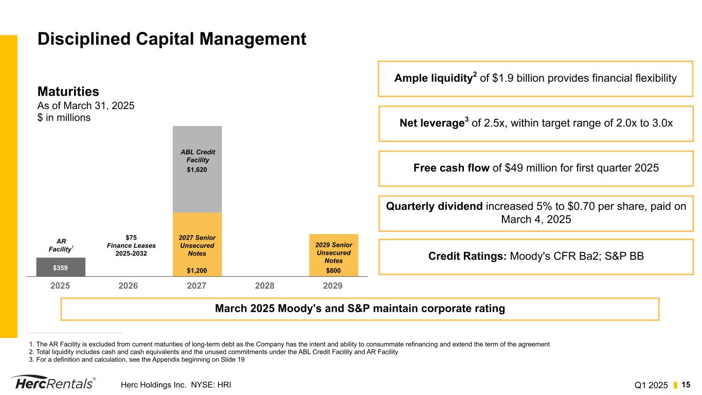 Q1 2025Herc Holdings Inc. NYSE: HRI 14 Q1 2025 Financial Results Excluding Cinelease Studio Entertainment1 * NM - Not Meaningful 1. Results excluding the Cinelease studio entertainment business is referred to as "core" business. For a reconciliation to the most comparable GAAP financial measures, see the Appendix beginning on Slide 19 2. REBITDA measures contribution from our core rental business without impact of sales of equipment, parts and supplies 3. Based on ARA guidelines Three Months Ended March 31, $ in millions 2025 2024 2025 vs 2024 % Change Core Equipment Rental Revenue $724 $690 4.9% Core Total Revenues $844 $774 9.0% Core Net Income ($18) $58 (131.0)% Core Adjusted EBITDA $338 $329 2.7% Core Adjusted EBITDA Margin 40.0% 42.5% (250) bps Core REBITDA2 $307 $304 1.0% Core REBITDA Margin2 42.1% 43.6% (150) bps Core REBITDA YoY Flow-Through2 9.1% 46.4% NM* Core Average Fleet3 (YoY) 9.7% 11.3% Core Dollar Utilization3 38.4% 40.2% (180) bps Core ROIC 9.8% 10.9% (110) bps