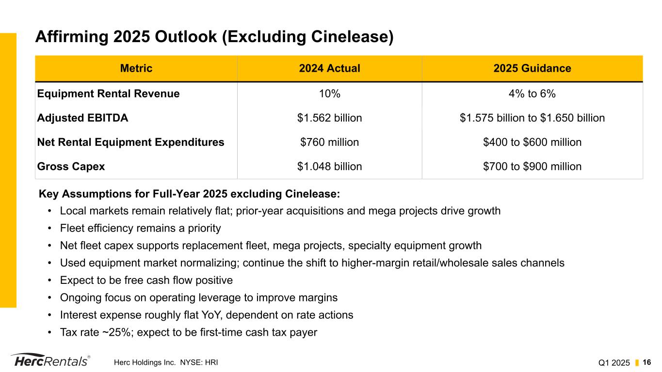 Q1 2025Herc Holdings Inc. NYSE: HRI 15 Disciplined Capital Management 1. The AR Facility is excluded from current maturities of long-term debt as the Company has the intent and ability to consummate refinancing and extend the term of the agreement 2. Total liquidity includes cash and cash equivalents and the unused commitments under the ABL Credit Facility and AR Facility 3. For a definition and calculation, see the Appendix beginning on Slide 19 Maturities As of March 31, 2025 $ in millions $1,200 $800 $1,620 $359 2025 2026 2027 2028 2029 $75 Finance Leases 2025-2032 2027 Senior Unsecured Notes ABL Credit Facility AR Facility1 2029 Senior Unsecured Notes ABL Credit Facility Ample liquidity2 of $1.9 billion provides financial flexibility Net leverage3 of 2.5x, within target range of 2.0x to 3.0x Free cash flow of $49 million for first quarter 2025 Quarterly dividend increased 5% to $0.70 per share, paid on March 4, 2025 Credit Ratings: Moody's CFR Ba2; S&P BB March 2025 Moody's and S&P maintain corporate rating