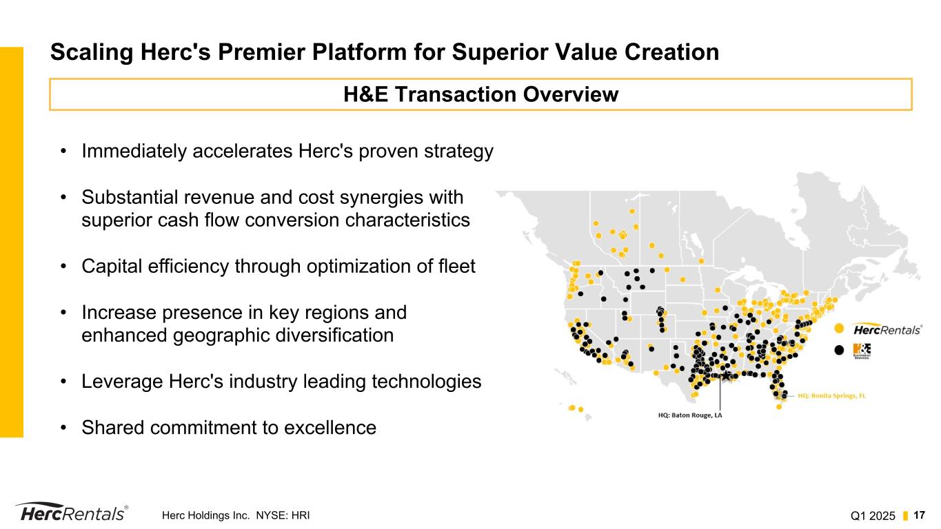 Q1 2025Herc Holdings Inc. NYSE: HRI 16 Affirming 2025 Outlook (Excluding Cinelease) Key Assumptions for Full-Year 2025 excluding Cinelease: • Local markets remain relatively flat; prior-year acquisitions and mega projects drive growth • Fleet efficiency remains a priority • Net fleet capex supports replacement fleet, mega projects, specialty equipment growth • Used equipment market normalizing; continue the shift to higher-margin retail/wholesale sales channels • Expect to be free cash flow positive • Ongoing focus on operating leverage to improve margins • Interest expense roughly flat YoY, dependent on rate actions • Tax rate ~25%; expect to be first-time cash tax payer Metric 2024 Actual 2025 Guidance Equipment Rental Revenue 10% 4% to 6% Adjusted EBITDA $1.562 billion $1.575 billion to $1.650 billion Net Rental Equipment Expenditures $760 million $400 to $600 million Gross Capex $1.048 billion $700 to $900 million