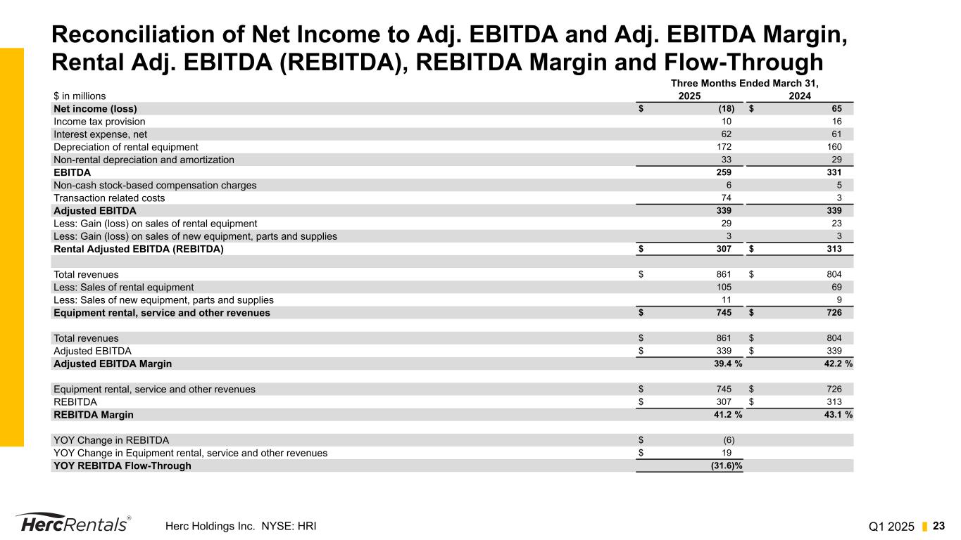 Q1 2025Herc Holdings Inc. NYSE: HRI 22 Reconciliation of Net Income to Adj. EBITDA and Adj. EBITDA Margin, Rental Adj. EBITDA (REBITDA), REBITDA Margin and Flow-Through EBITDA, Adjusted EBITDA, and REBITDA—EBITDA represents the sum of net income, provision (benefit) for income taxes, interest expense, net, depreciation of rental equipment and non-rental depreciation and amortization. Adjusted EBITDA represents EBITDA plus the sum of transaction related costs, restructuring and restructuring related charges, spin-off costs, non-cash stock based compensation charges, loss on extinguishment of debt (which is included in interest expense, net), impairment charges, gain (loss) on disposal of a business and certain other items. REBITDA represents Adjusted EBITDA excluding the gain (loss) on sales of rental equipment and new equipment, parts and supplies. EBITDA, Adjusted EBITDA and REBITDA do not purport to be alternatives to net income as an indicator of operating performance. Additionally, none of these measures purports to be an alternative to cash flows from operating activities as a measure of liquidity, as they do not consider certain cash requirements such as interest payments and tax payments. Adjusted EBITDA Margin, REBITDA Margin and REBITDA Flow-Through—Adjusted EBITDA Margin (Adjusted EBITDA / Total Revenues) is a commonly used profitability ratio. REBITDA Margin (REBITDA / Equipment rental, service and other revenues) and REBITDA Flow- Through (the year-over-year change in REBITDA/the year-over-year change in Equipment rental, service, and other revenues) are useful operating profitability ratios to management and investors. EBITDA, Adjusted EBITDA, REBITDA, Adjusted EBITDA Margin, REBITDA Margin and REBITDA Flow-Through Excluding Studio Entertainment—On slide 24, each metric has been adjusted to exclude the studio entertainment business due to the intent to sell that business and provides the operating performance of the remaining business.