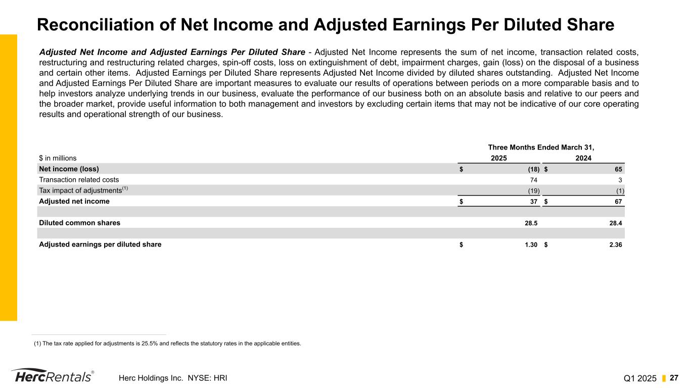 Q1 2025Herc Holdings Inc. NYSE: HRI 26 REBITDA Margin and Flow-Through Annual Trend $ in millions 2020 2021 2022 2023 2024 Net income $ 74 $ 224 $ 330 $ 347 $ 211 Income tax provision 20 67 104 100 80 Interest expense, net 93 86 122 224 260 Depreciation of rental equipment 403 420 536 643 679 Non-rental depreciation and amortization 63 68 95 112 127 EBITDA 653 865 1,187 1,426 1,357 Non-cash stock-based compensation charges 16 23 27 18 17 Restructuring 1 — — — — Impairment 15 3 3 — — Transaction related costs — 4 7 8 11 Loss on assets held for sale / disposal of business 3 — — — 194 Other 1 — 3 — 4 Adjusted EBITDA 689 895 1,227 1,452 1,583 Less: Gain (loss) on sales of rental equipment (5) 19 36 94 87 Less: Gain (loss) on sales of new equipment, parts and supplies 8 10 15 13 13 Rental Adjusted EBITDA (REBITDA) $ 686 $ 866 $ 1,176 $ 1,345 $ 1,483 Total revenues $ 1,780 $ 2,073 $ 2,740 $ 3,282 $ 3,568 Less: Sales of rental equipment 198 113 125 346 311 Less: Sales of new equipment, parts and supplies 28 31 36 38 37 Equipment rental, service and other revenues $ 1,554 $ 1,929 $ 2,579 $ 2,898 $ 3,220 REBITDA Margin 44.2 % 44.8 % 45.7 % 46.4 % 46.1 % YOY REBITDA Flow-Through 27.9 % 47.5 % 48.1 % 53.0 % 42.9 %