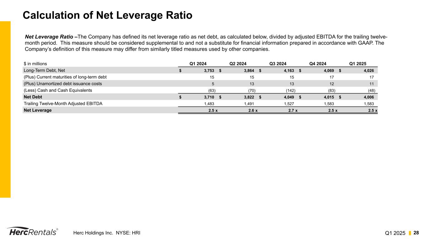 Q1 2025Herc Holdings Inc. NYSE: HRI 27 Reconciliation of Net Income and Adjusted Earnings Per Diluted Share Three Months Ended March 31, $ in millions 2025 2024 Net income (loss) $ (18) $ 65 Transaction related costs 74 3 Tax impact of adjustments(1) (19) (1) Adjusted net income $ 37 $ 67 Diluted common shares 28.5 28.4 Adjusted earnings per diluted share $ 1.30 $ 2.36 Adjusted Net Income and Adjusted Earnings Per Diluted Share - Adjusted Net Income represents the sum of net income, transaction related costs, restructuring and restructuring related charges, spin-off costs, loss on extinguishment of debt, impairment charges, gain (loss) on the disposal of a business and certain other items. Adjusted Earnings per Diluted Share represents Adjusted Net Income divided by diluted shares outstanding. Adjusted Net Income and Adjusted Earnings Per Diluted Share are important measures to evaluate our results of operations between periods on a more comparable basis and to help investors analyze underlying trends in our business, evaluate the performance of our business both on an absolute basis and relative to our peers and the broader market, provide useful information to both management and investors by excluding certain items that may not be indicative of our core operating results and operational strength of our business. (1) The tax rate applied for adjustments is 25.5% and reflects the statutory rates in the applicable entities.