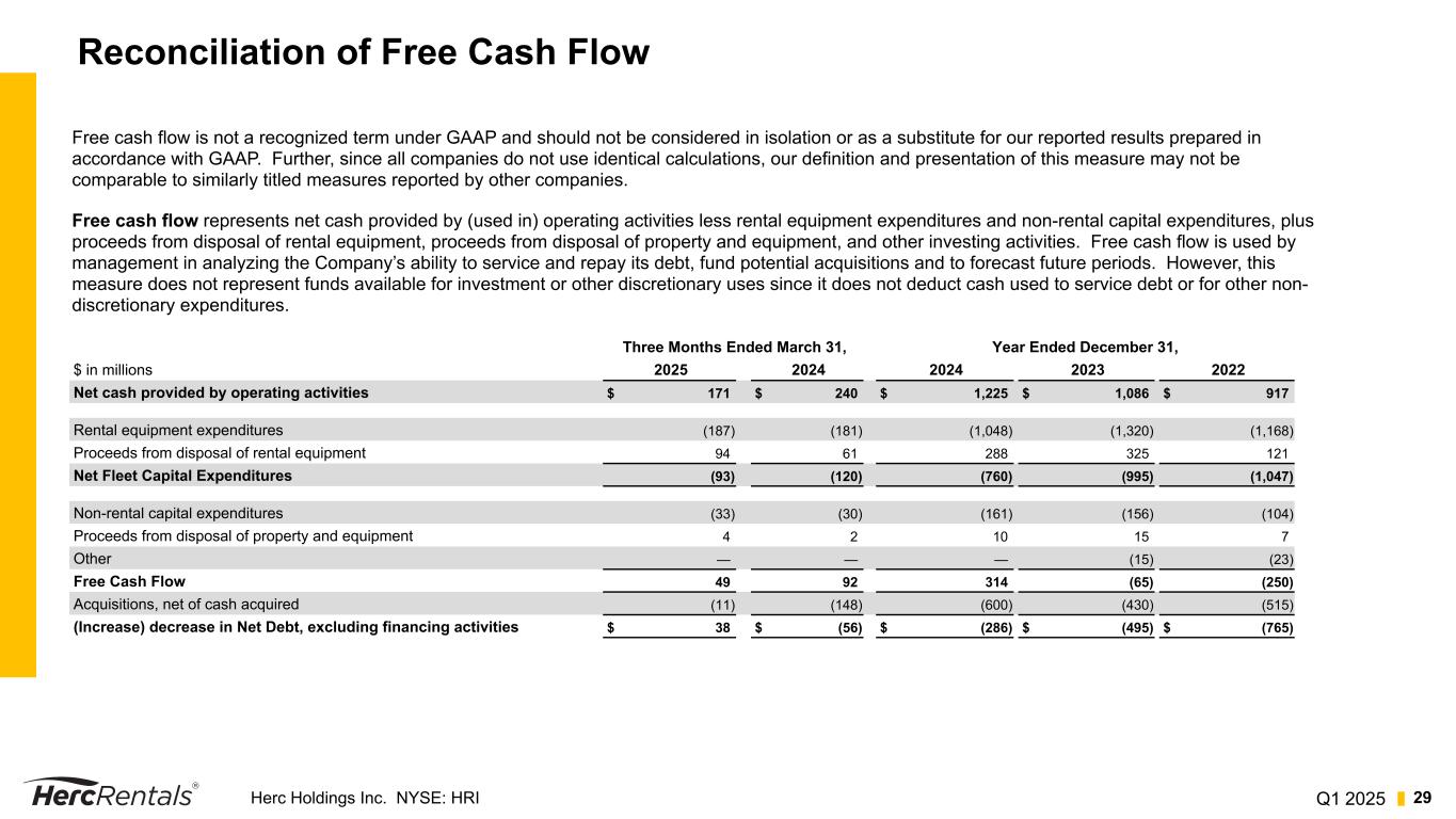 Q1 2025Herc Holdings Inc. NYSE: HRI 28 Calculation of Net Leverage Ratio $ in millions Q1 2024 Q2 2024 Q3 2024 Q4 2024 Q1 2025 Long-Term Debt, Net $ 3,753 $ 3,864 $ 4,163 $ 4,069 $ 4,026 (Plus) Current maturities of long-term debt 15 15 15 17 17 (Plus) Unamortized debt issuance costs 5 13 13 12 11 (Less) Cash and Cash Equivalents (63) (70) (142) (83) (48) Net Debt $ 3,710 $ 3,822 $ 4,049 $ 4,015 $ 4,006 Trailing Twelve-Month Adjusted EBITDA 1,483 1,491 1,527 1,583 1,583 Net Leverage 2.5 x 2.6 x 2.7 x 2.5 x 2.5 x Net Leverage Ratio –The Company has defined its net leverage ratio as net debt, as calculated below, divided by adjusted EBITDA for the trailing twelve- month period. This measure should be considered supplemental to and not a substitute for financial information prepared in accordance with GAAP. The Company’s definition of this measure may differ from similarly titled measures used by other companies.