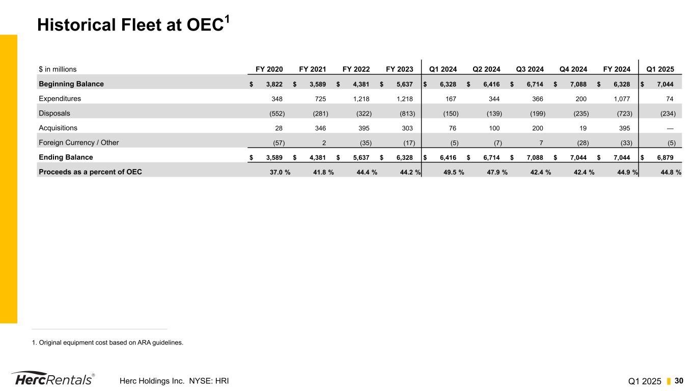 Q1 2025Herc Holdings Inc. NYSE: HRI 29 Reconciliation of Free Cash Flow Three Months Ended March 31, Year Ended December 31, $ in millions 2025 2024 2024 2023 2022 Net cash provided by operating activities $ 171 $ 240 $ 1,225 $ 1,086 $ 917 Rental equipment expenditures (187) (181) (1,048) (1,320) (1,168) Proceeds from disposal of rental equipment 94 61 288 325 121 Net Fleet Capital Expenditures (93) (120) (760) (995) (1,047) Non-rental capital expenditures (33) (30) (161) (156) (104) Proceeds from disposal of property and equipment 4 2 10 15 7 Other — — — (15) (23) Free Cash Flow 49 92 314 (65) (250) Acquisitions, net of cash acquired (11) (148) (600) (430) (515) (Increase) decrease in Net Debt, excluding financing activities $ 38 $ (56) $ (286) $ (495) $ (765) Free cash flow is not a recognized term under GAAP and should not be considered in isolation or as a substitute for our reported results prepared in accordance with GAAP. Further, since all companies do not use identical calculations, our definition and presentation of this measure may not be comparable to similarly titled measures reported by other companies. Free cash flow represents net cash provided by (used in) operating activities less rental equipment expenditures and non-rental capital expenditures, plus proceeds from disposal of rental equipment, proceeds from disposal of property and equipment, and other investing activities. Free cash flow is used by management in analyzing the Company’s ability to service and repay its debt, fund potential acquisitions and to forecast future periods. However, this measure does not represent funds available for investment or other discretionary uses since it does not deduct cash used to service debt or for other non- discretionary expenditures.