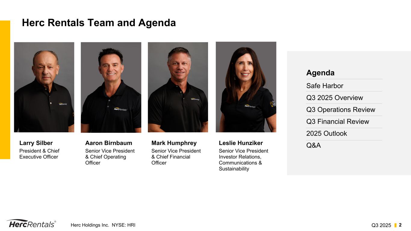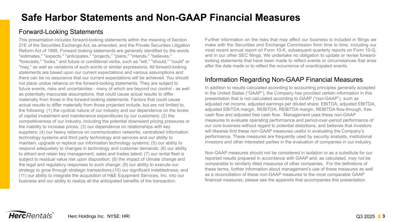 Q3 2025Herc Holdings Inc. NYSE: HRI 2 Herc Rentals Team and Agenda Agenda Safe Harbor Q3 2025 Overview Q3 Operations Review Q3 Financial Review 2025 Outlook Q&ALarry Silber President & Chief Executive Officer Aaron Birnbaum Senior Vice President & Chief Operating Officer Mark Humphrey Senior Vice President & Chief Financial Officer Leslie Hunziker Senior Vice President Investor Relations, Communications & Sustainability
