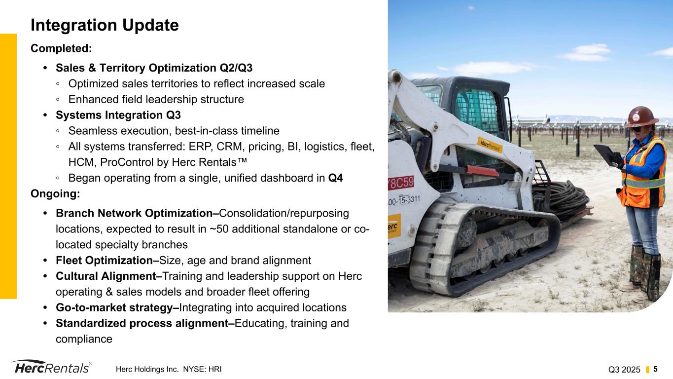 Q3 2025Herc Holdings Inc. NYSE: HRI 3 Safe Harbor Statements and Non-GAAP Financial Measures Forward-Looking Statements This presentation includes forward-looking statements within the meaning of Section 21E of the Securities Exchange Act, as amended, and the Private Securities Litigation Reform Act of 1995. Forward looking statements are generally identified by the words "estimates," "expects," "anticipates," "projects," "plans," "intends," "believes," "forecasts," "looks," and future or conditional verbs, such as "will," "should," "could" or "may," as well as variations of such words or similar expressions. All forward-looking statements are based upon our current expectations and various assumptions and there can be no assurance that our current expectations will be achieved. You should not place undue reliance on the forward-looking statements. They are subject to future events, risks and uncertainties - many of which are beyond our control - as well as potentially inaccurate assumptions, that could cause actual results to differ materially from those in the forward-looking statements. Factors that could cause actual results to differ materially from those projected include, but are not limited to, the following: (1) the cyclical nature of our industry and our dependence on the levels of capital investment and maintenance expenditures by our customers; (2) the competitiveness of our industry, including the potential downward pricing pressures or the inability to increase prices; (3) our dependence on relationships with key suppliers; (4) our heavy reliance on communication networks, centralized information technology systems and third party technology and services and our ability to maintain, upgrade or replace our information technology systems; (5) our ability to respond adequately to changes in technology and customer demands; (6) our ability to attract and retain key management, sales and trades talent; (7) our rental fleet is subject to residual value risk upon disposition; (8) the impact of climate change and the legal and regulatory responses to such change; (9) our ability to execute our strategy to grow through strategic transactions;(10) our significant indebtedness; and (11) our ability to integrate the acquisition of H&E Equipment Services, Inc. into our business and our ability to realize all the anticipated benefits of the transaction. Further information on the risks that may affect our business is included in filings we make with the Securities and Exchange Commission from time to time, including our most recent annual report on Form 10-K, subsequent quarterly reports on Form 10-Q, and in our other SEC filings. We undertake no obligation to update or revise forward- looking statements that have been made to reflect events or circumstances that arise after the date made or to reflect the occurrence of unanticipated events. Information Regarding Non-GAAP Financial Measures In addition to results calculated according to accounting principles generally accepted in the United States (“GAAP”), the Company has provided certain information in this presentation that is not calculated according to GAAP (“non-GAAP”), such as adjusted net income, adjusted earnings per diluted share, EBITDA, adjusted EBITDA, adjusted EBITDA margin, REBITDA, REBITDA margin, REBITDA flow-through, free cash flow and adjusted free cash flow. Management uses these non-GAAP measures to evaluate operating performance and period-over-period performance of our core business without regard to potential distortions, and believes that investors will likewise find these non-GAAP measures useful in evaluating the Company’s performance. These measures are frequently used by security analysts, institutional investors and other interested parties in the evaluation of companies in our industry. Non-GAAP measures should not be considered in isolation or as a substitute for our reported results prepared in accordance with GAAP and, as calculated, may not be comparable to similarly titled measures of other companies. For the definitions of these terms, further information about management’s use of these measures as well as a reconciliation of these non-GAAP measures to the most comparable GAAP financial measures, please see the appendix that accompanies this presentation.