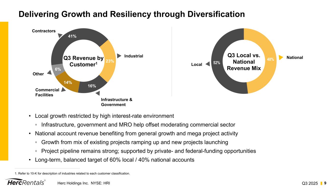 Q3 2025Herc Holdings Inc. NYSE: HRI 9 Delivering Growth and Resiliency through Diversification Q3 Local vs. National Revenue Mix 48% 52% NationalQ3 Revenue by Customer1 41% 23% 16% 14% 6% Local Commercial Facilities Contractors Infrastructure & Government Other Industrial • Local growth restricted by high interest-rate environment ◦ Infrastructure, government and MRO help offset moderating commercial sector • National account revenue benefiting from general growth and mega project activity ◦ Growth from mix of existing projects ramping up and new projects launching ◦ Project pipeline remains strong; supported by private- and federal-funding opportunities • Long-term, balanced target of 60% local / 40% national accounts 1. Refer to 10-K for description of industries related to each customer classification.