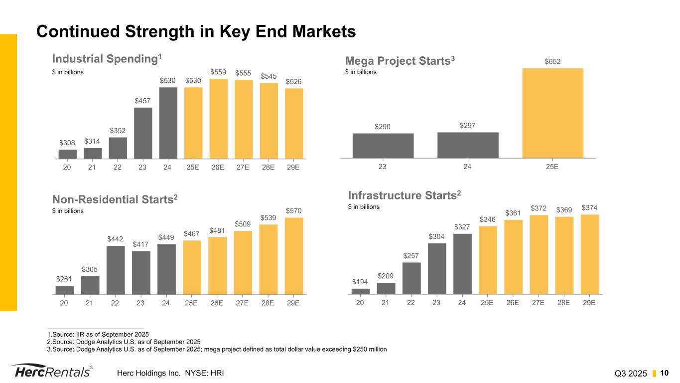Q3 2025Herc Holdings Inc. NYSE: HRI 10 Continued Strength in Key End Markets 1.Source: IIR as of September 2025 2.Source: Dodge Analytics U.S. as of September 2025 3.Source: Dodge Analytics U.S. as of September 2025; mega project defined as total dollar value exceeding $250 million Industrial Spending1 $308 $314 $352 $457 $530 $530 $559 $555 $545 $526 20 21 22 23 24 25E 26E 27E 28E 29E $ in billions Non-Residential Starts2 $261 $305 $442 $417 $449 $467 $481 $509 $539 $570 20 21 22 23 24 25E 26E 27E 28E 29E $ in billions Infrastructure Starts2 $194 $209 $257 $304 $327 $346 $361 $372 $369 $374 20 21 22 23 24 25E 26E 27E 28E 29E $ in billions Mega Project Starts3 $290 $297 $652 23 24 25E $ in billions