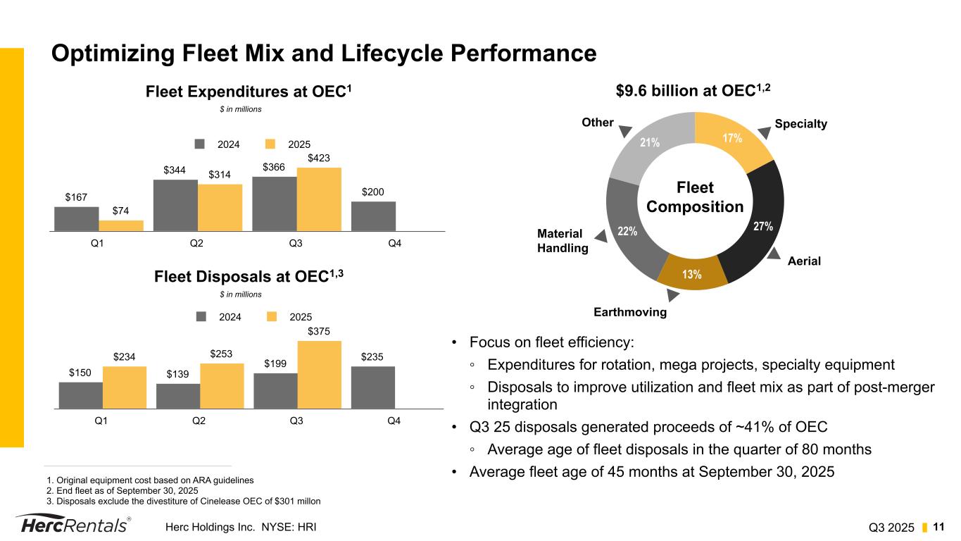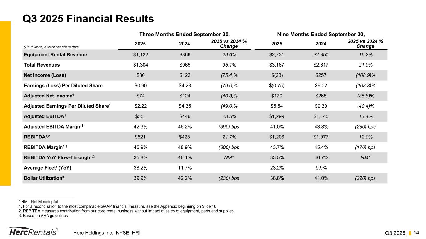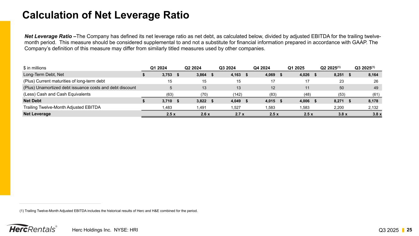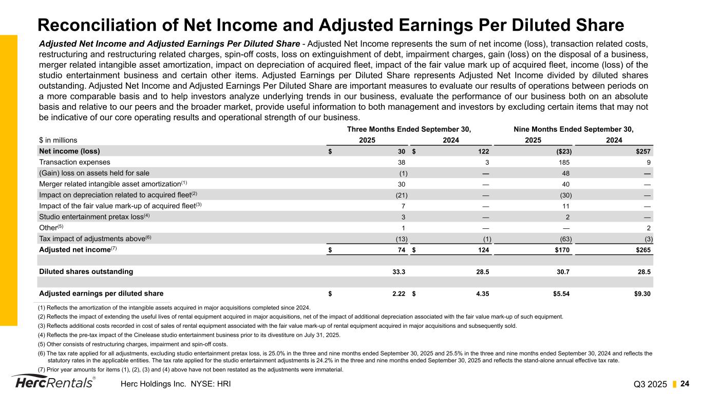 Q3 2025Herc Holdings Inc. NYSE: HRI 24 Reconciliation of Net Income and Adjusted Earnings Per Diluted Share Three Months Ended September 30, Nine Months Ended September 30, $ in millions 2025 2024 2025 2024 Net income (loss) $ 30 $ 122 ($23) $257 Transaction expenses 38 3 185 9 (Gain) loss on assets held for sale (1) — 48 — Merger related intangible asset amortization(1) 30 — 40 — Impact on depreciation related to acquired fleet(2) (21) — (30) — Impact of the fair value mark-up of acquired fleet(3) 7 — 11 — Studio entertainment pretax loss(4) 3 — 2 — Other(5) 1 — — 2 Tax impact of adjustments above(6) (13) (1) (63) (3) Adjusted net income(7) $ 74 $ 124 $170 $265 Diluted shares outstanding 33.3 28.5 30.7 28.5 Adjusted earnings per diluted share $ 2.22 $ 4.35 $5.54 $9.30 Adjusted Net Income and Adjusted Earnings Per Diluted Share - Adjusted Net Income represents the sum of net income (loss), transaction related costs, restructuring and restructuring related charges, spin-off costs, loss on extinguishment of debt, impairment charges, gain (loss) on the disposal of a business, merger related intangible asset amortization, impact on depreciation of acquired fleet, impact of the fair value mark up of acquired fleet, income (loss) of the studio entertainment business and certain other items. Adjusted Earnings per Diluted Share represents Adjusted Net Income divided by diluted shares outstanding. Adjusted Net Income and Adjusted Earnings Per Diluted Share are important measures to evaluate our results of operations between periods on a more comparable basis and to help investors analyze underlying trends in our business, evaluate the performance of our business both on an absolute basis and relative to our peers and the broader market, provide useful information to both management and investors by excluding certain items that may not be indicative of our core operating results and operational strength of our business. (1) Reflects the amortization of the intangible assets acquired in major acquisitions completed since 2024. (2) Reflects the impact of extending the useful lives of rental equipment acquired in major acquisitions, net of the impact of additional depreciation associated with the fair value mark-up of such equipment. (3) Reflects additional costs recorded in cost of sales of rental equipment associated with the fair value mark-up of rental equipment acquired in major acquisitions and subsequently sold. (4) Reflects the pre-tax impact of the Cinelease studio entertainment business prior to its divestiture on July 31, 2025. (5) Other consists of restructuring charges, impairment and spin-off costs. (6) The tax rate applied for all adjustments, excluding studio entertainment pretax loss, is 25.0% in the three and nine months ended September 30, 2025 and 25.5% in the three and nine months ended September 30, 2024 and reflects the statutory rates in the applicable entities. The tax rate applied for the studio entertainment adjustments is 24.2% in the three and nine months ended September 30, 2025 and reflects the stand-alone annual effective tax rate. (7) Prior year amounts for items (1), (2), (3) and (4) above have not been restated as the adjustments were immaterial.